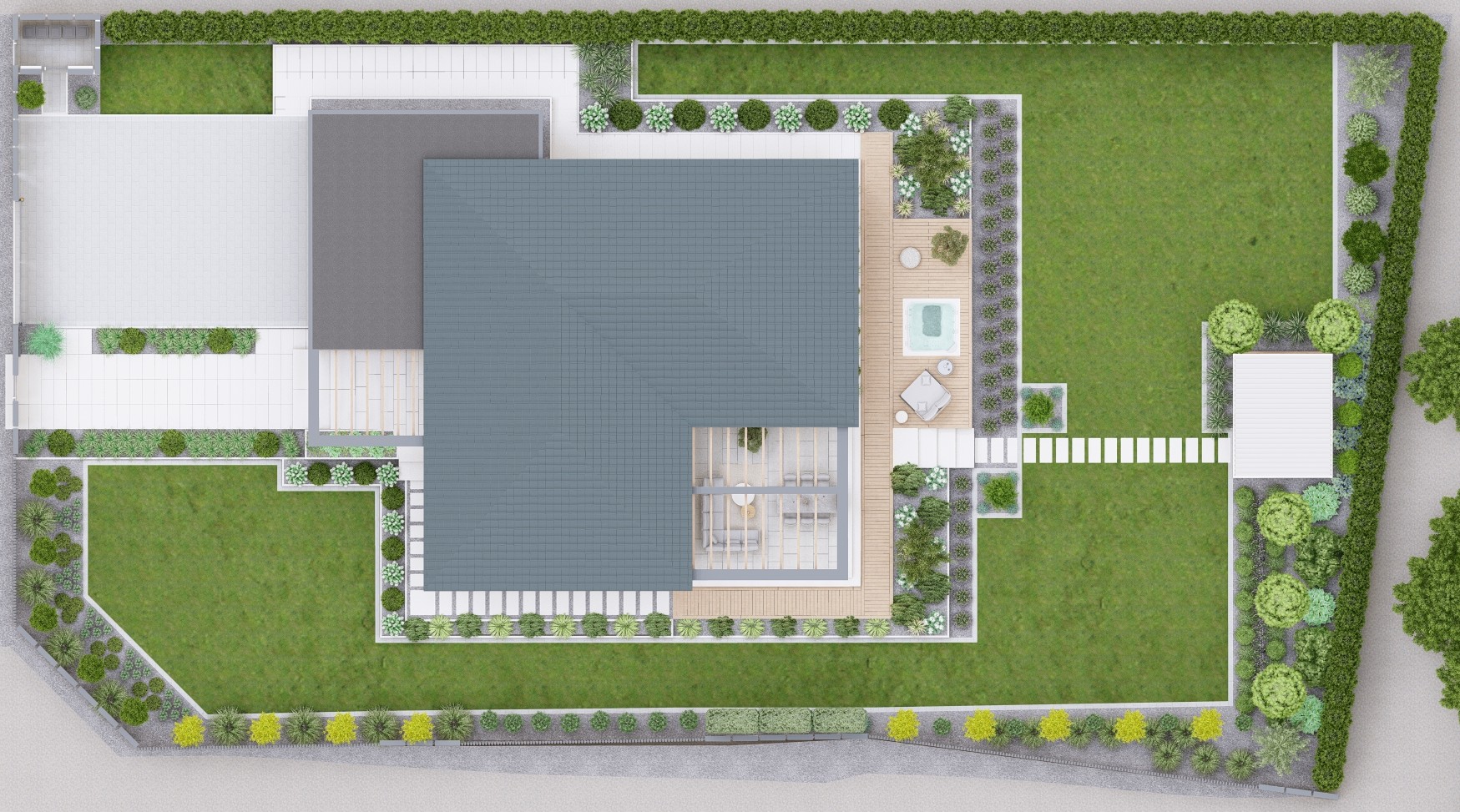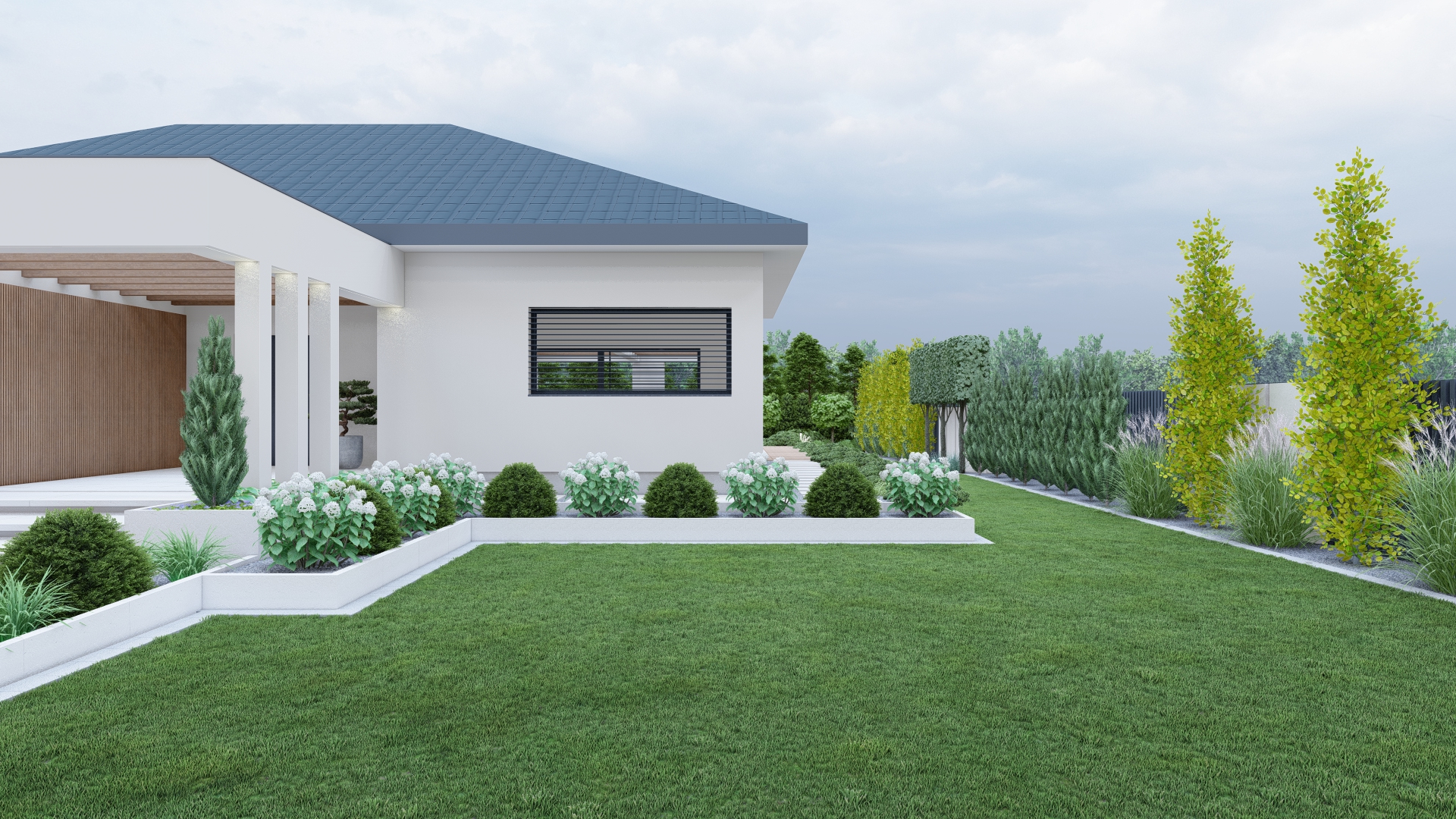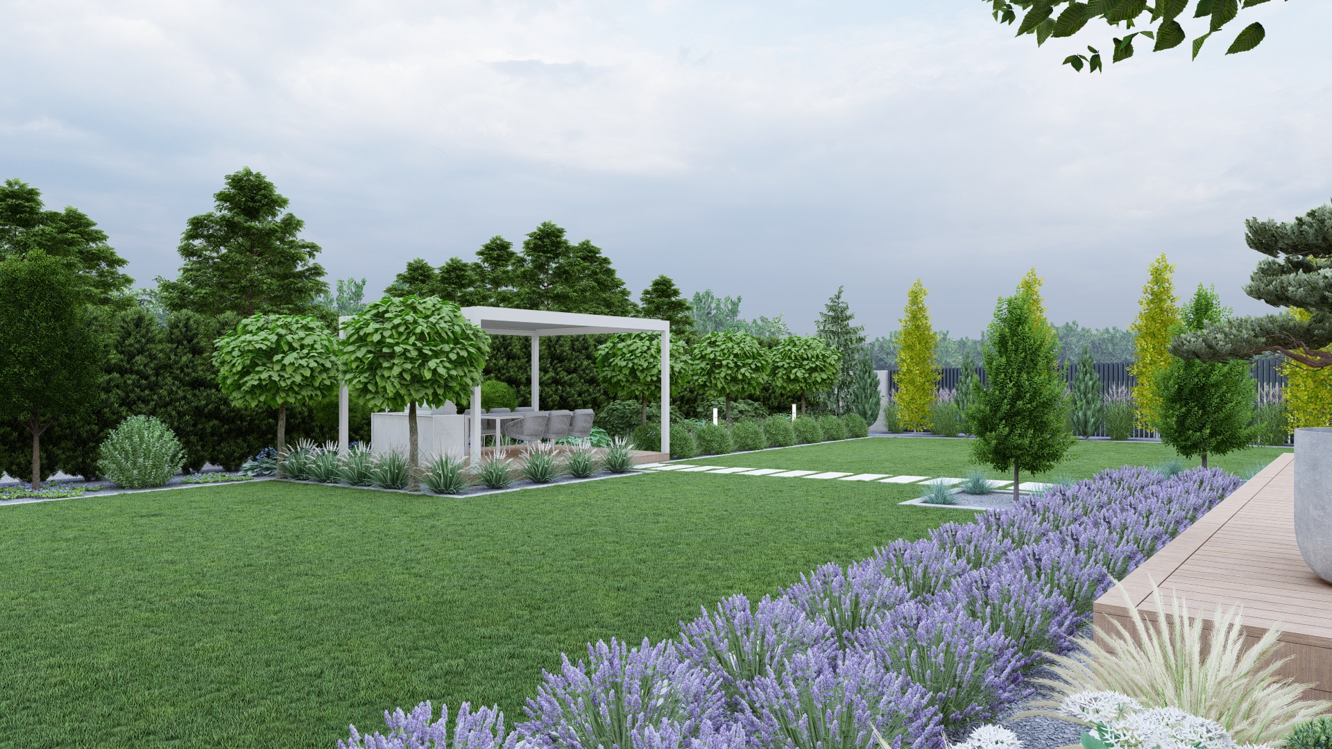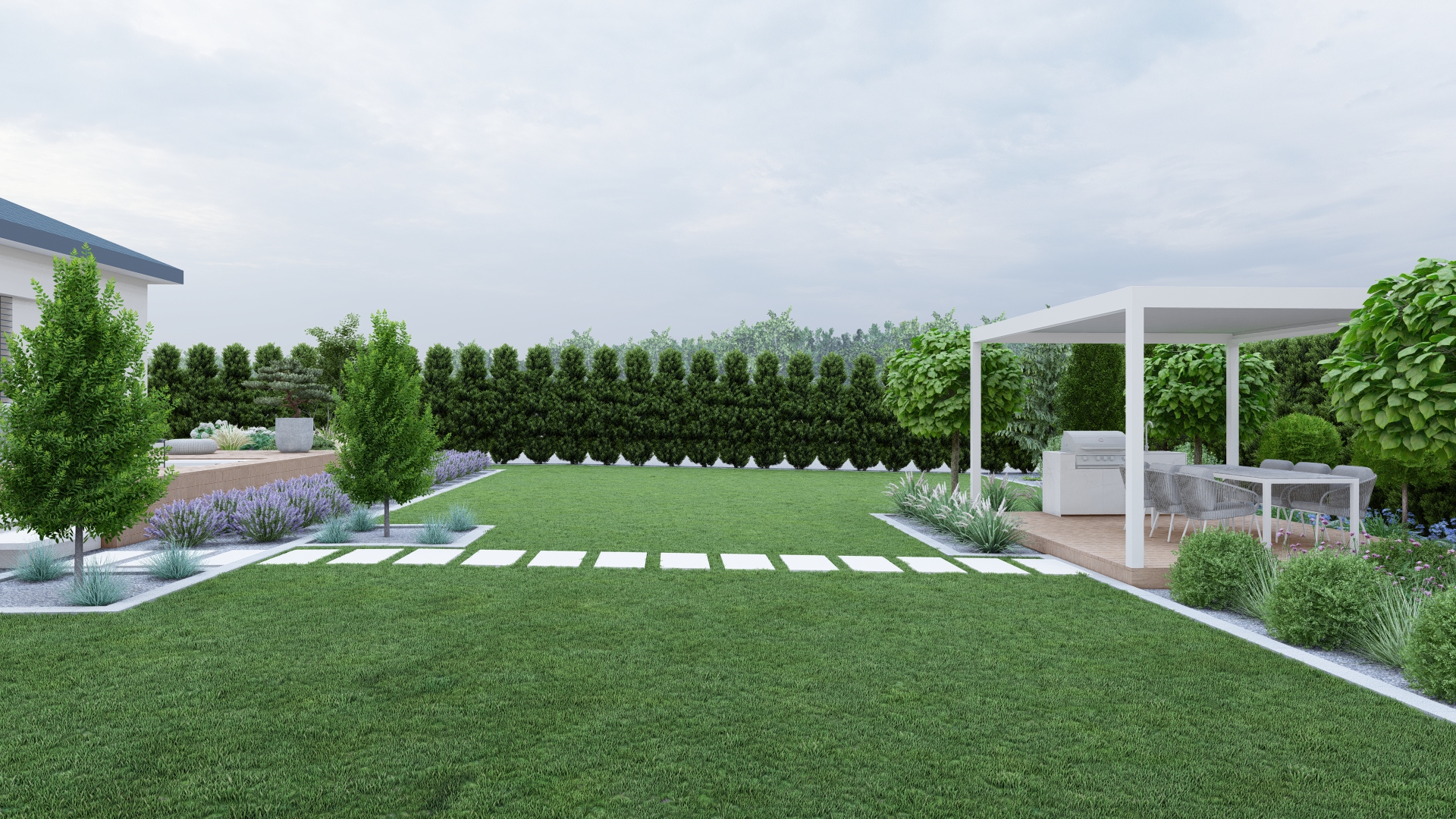 To ogród, w którym luksus idzie w parze z minimalizmem – przestrzeń piękna, funkcjonalna i bezobsługowa.
