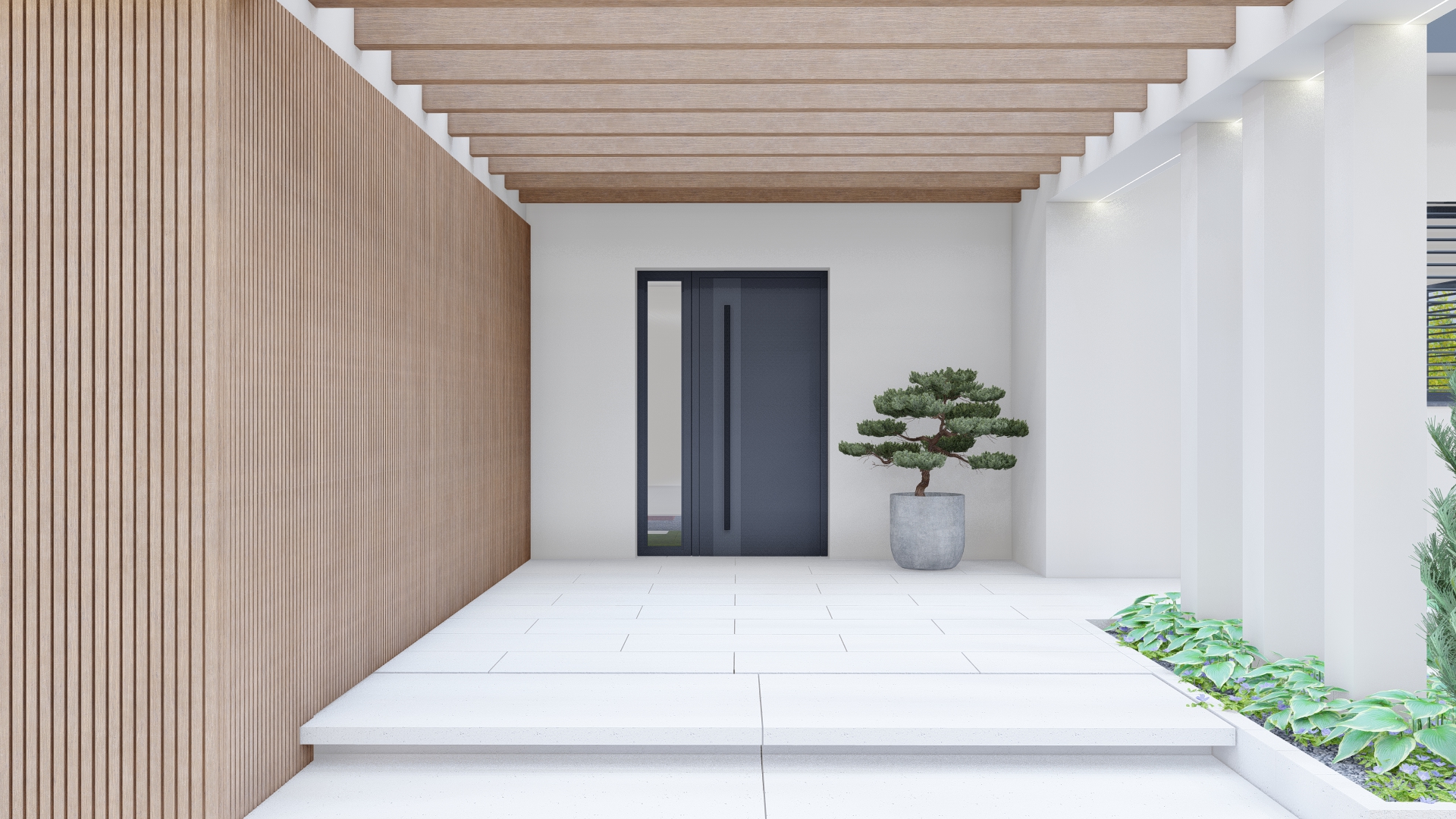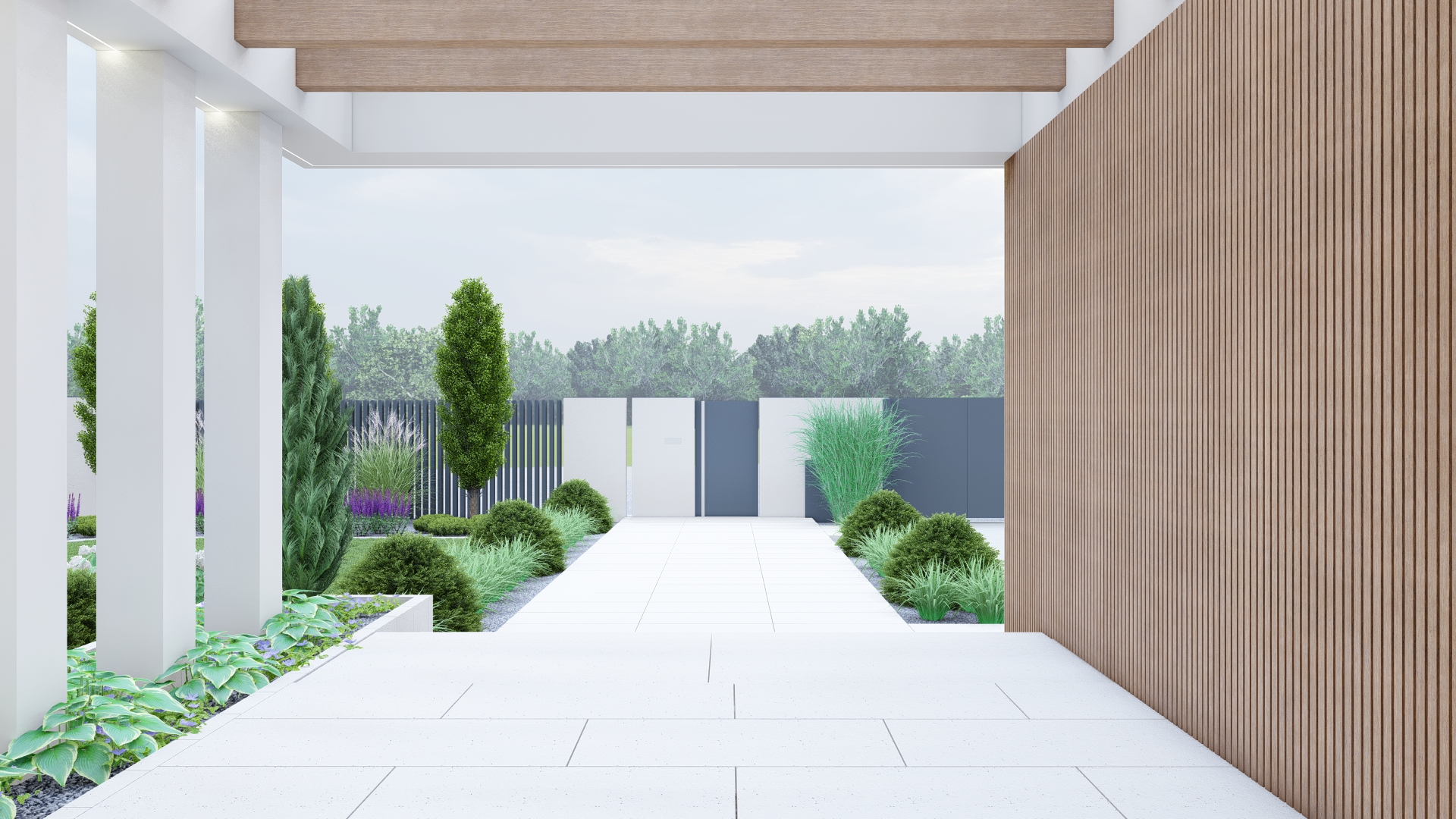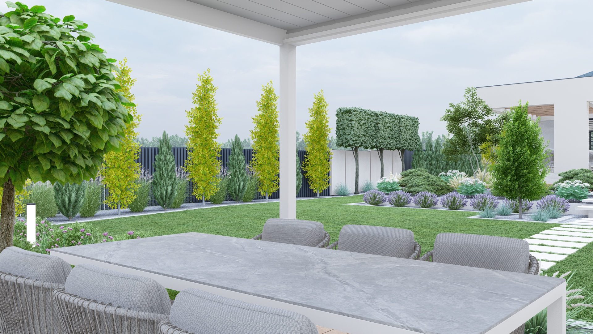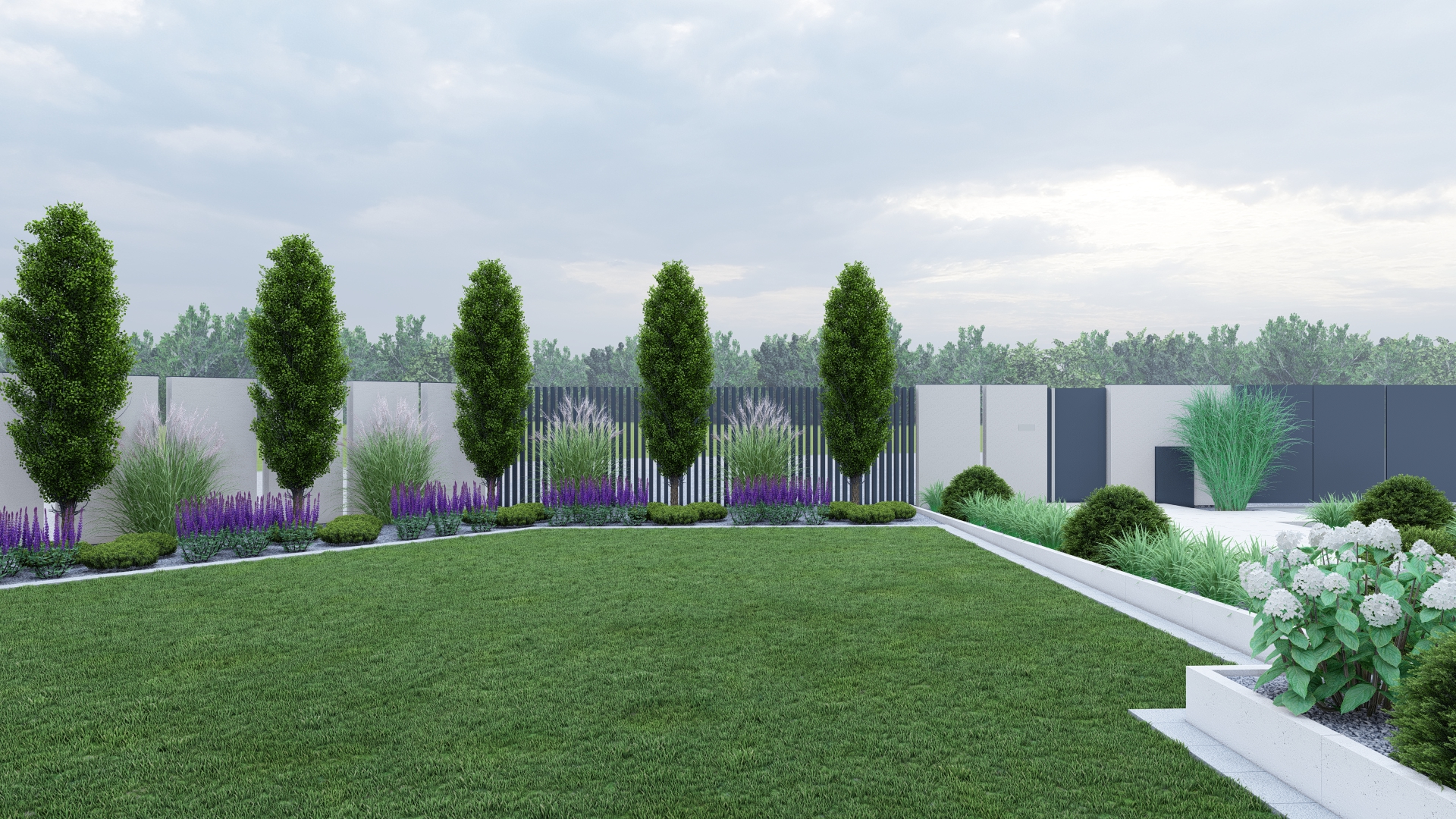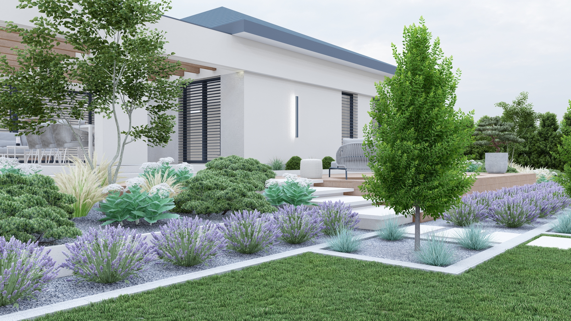 Roślinność w tonacjach zieleni, bieli i fioletu – minimalistyczna, ale o wysokiej wartości dekoracyjnej.