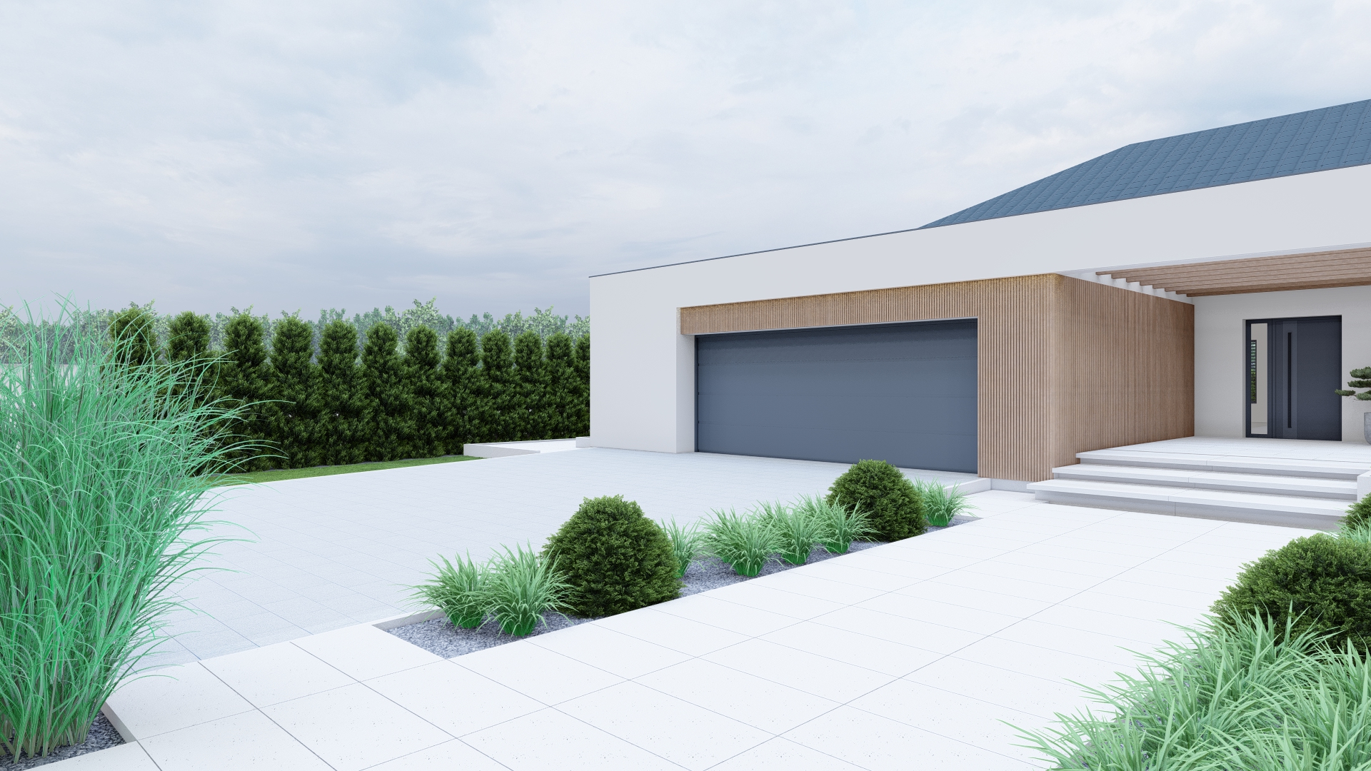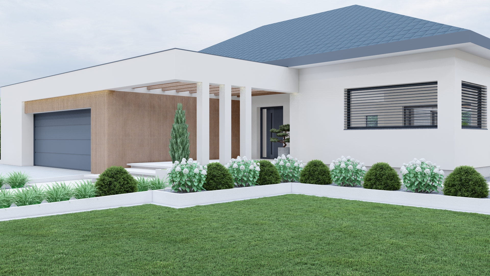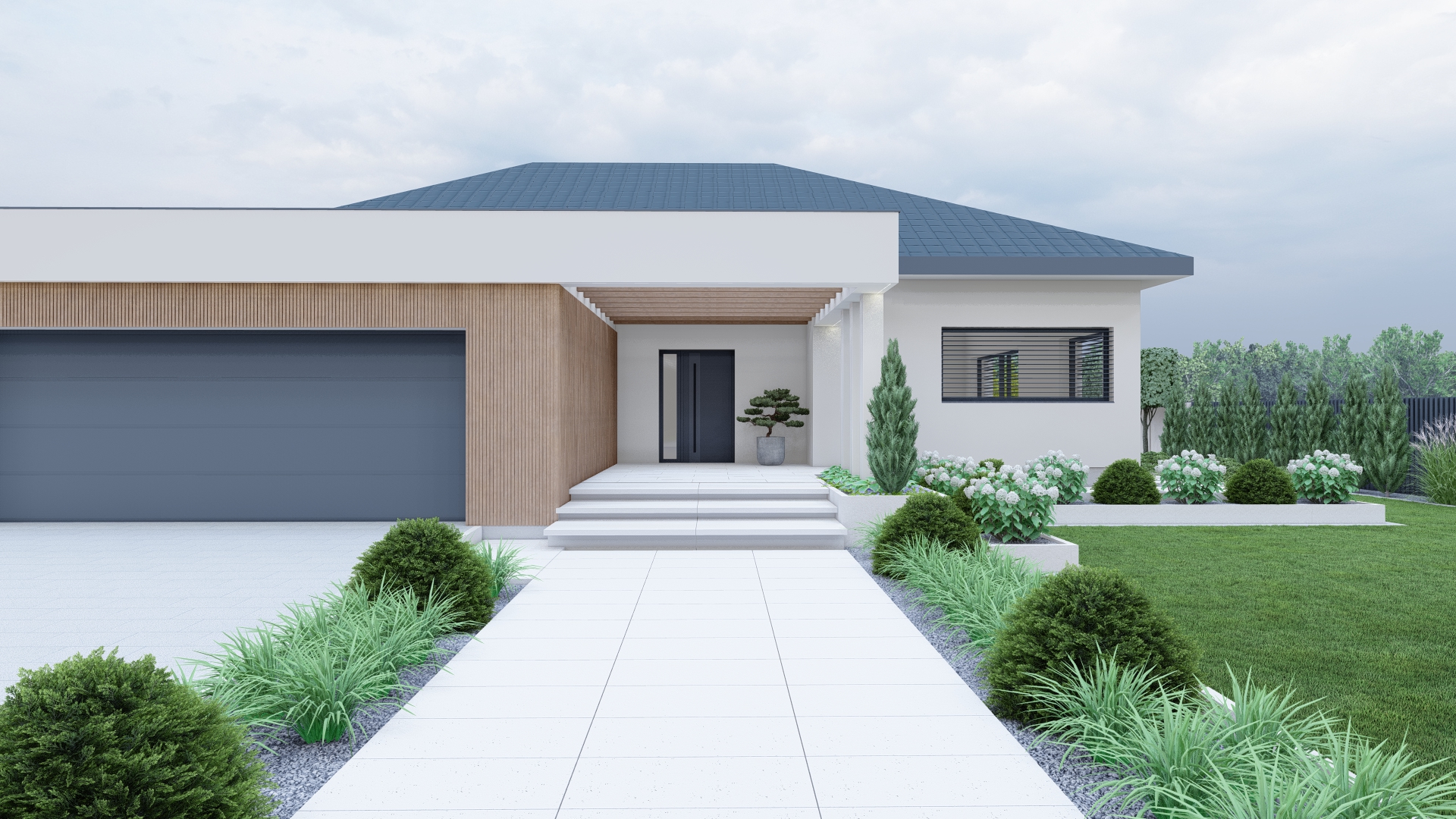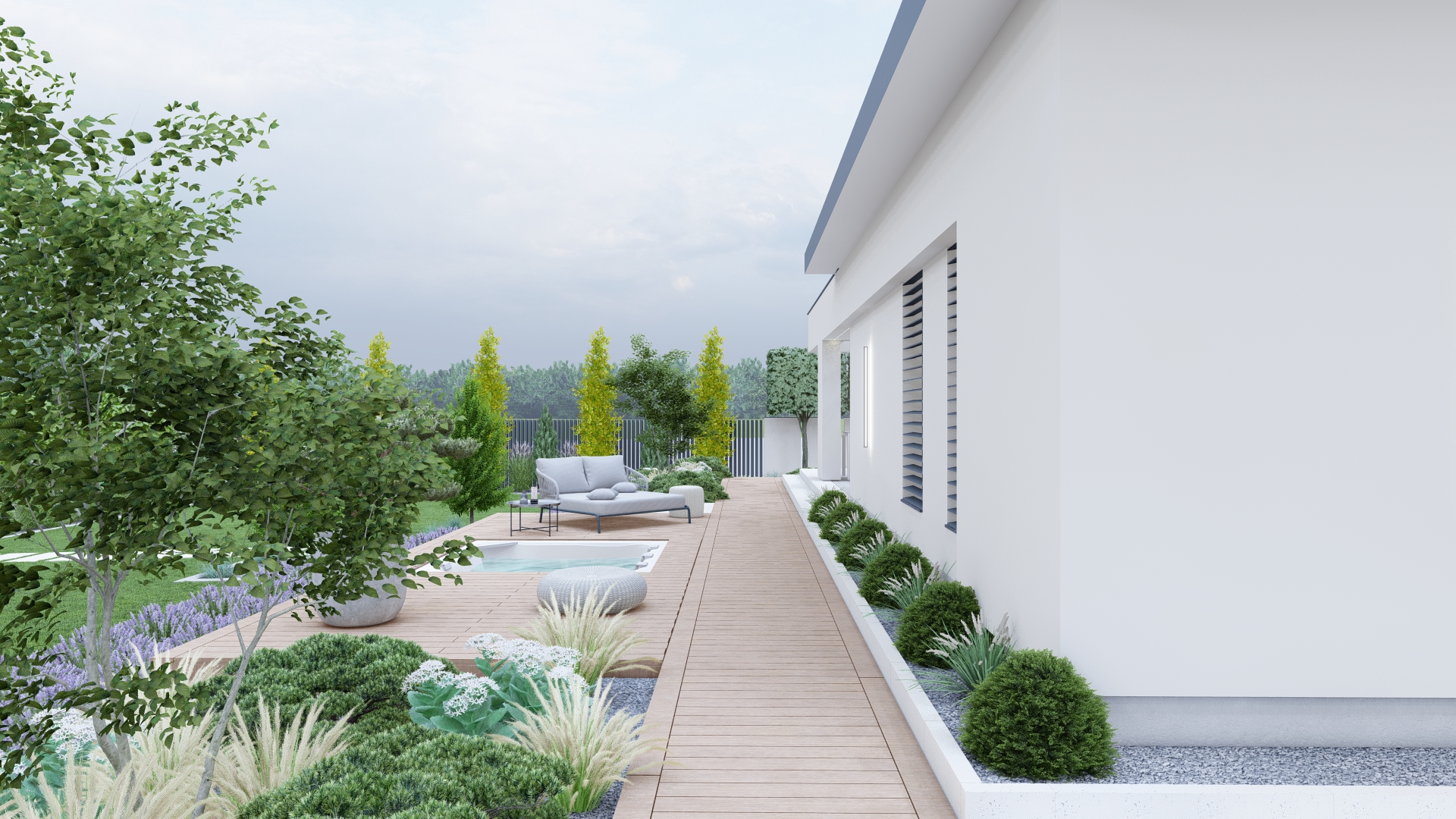 Ten projekt powstał z myślą o stworzeniu ogrodu, który łączy elegancję nowoczesnych form z praktycznymi rozwiązaniami sprzyjającymi codziennemu odpoczynkowi. Dominują tu geometryczne linie, stonowana kolorystyka i luksusowe strefy relaksu.