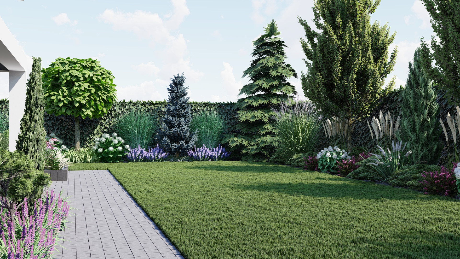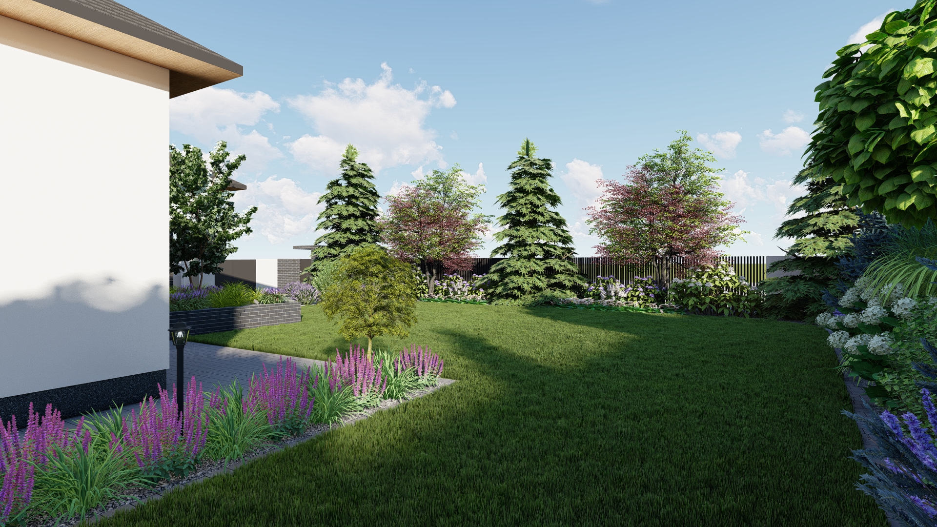 Ten projekt łączy prostotę nowoczesnych form z naturalnym charakterem nasadzeń. Dzięki odpowiedniemu doborowi roślin ogród jest atrakcyjny przez cały rok – intensywnie kwitnący latem i strukturalny zimą.