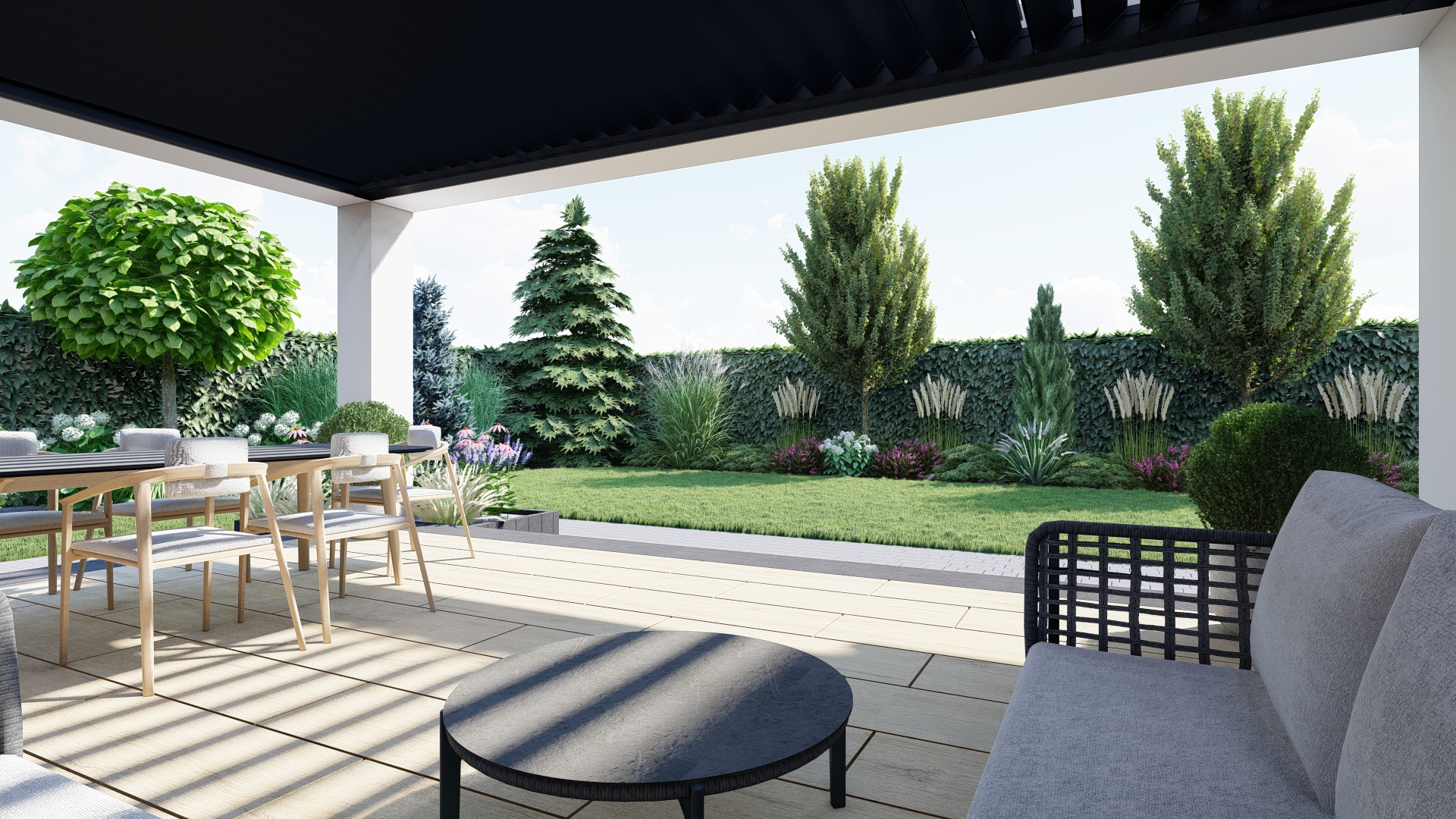 Ten ogród to nowoczesność z duszą – subtelnie zorganizowany, ale pełen naturalnej swobody.