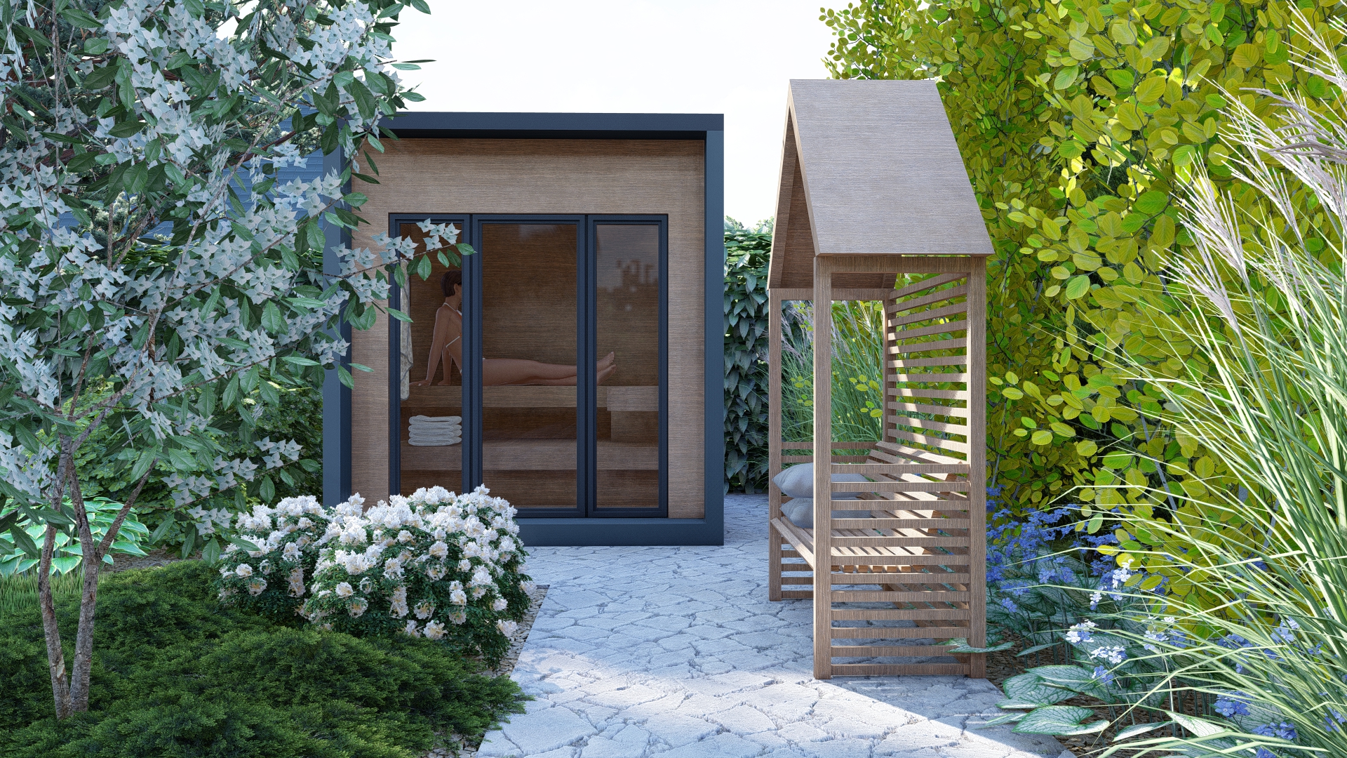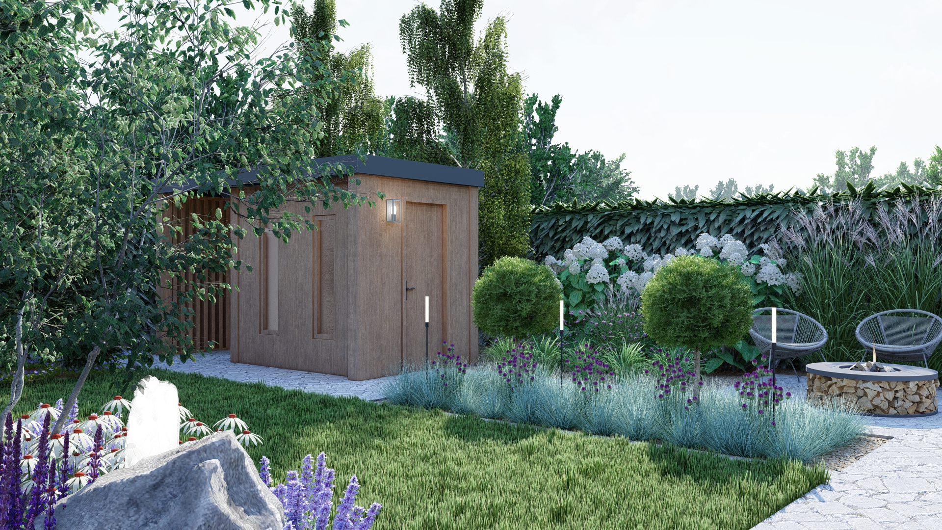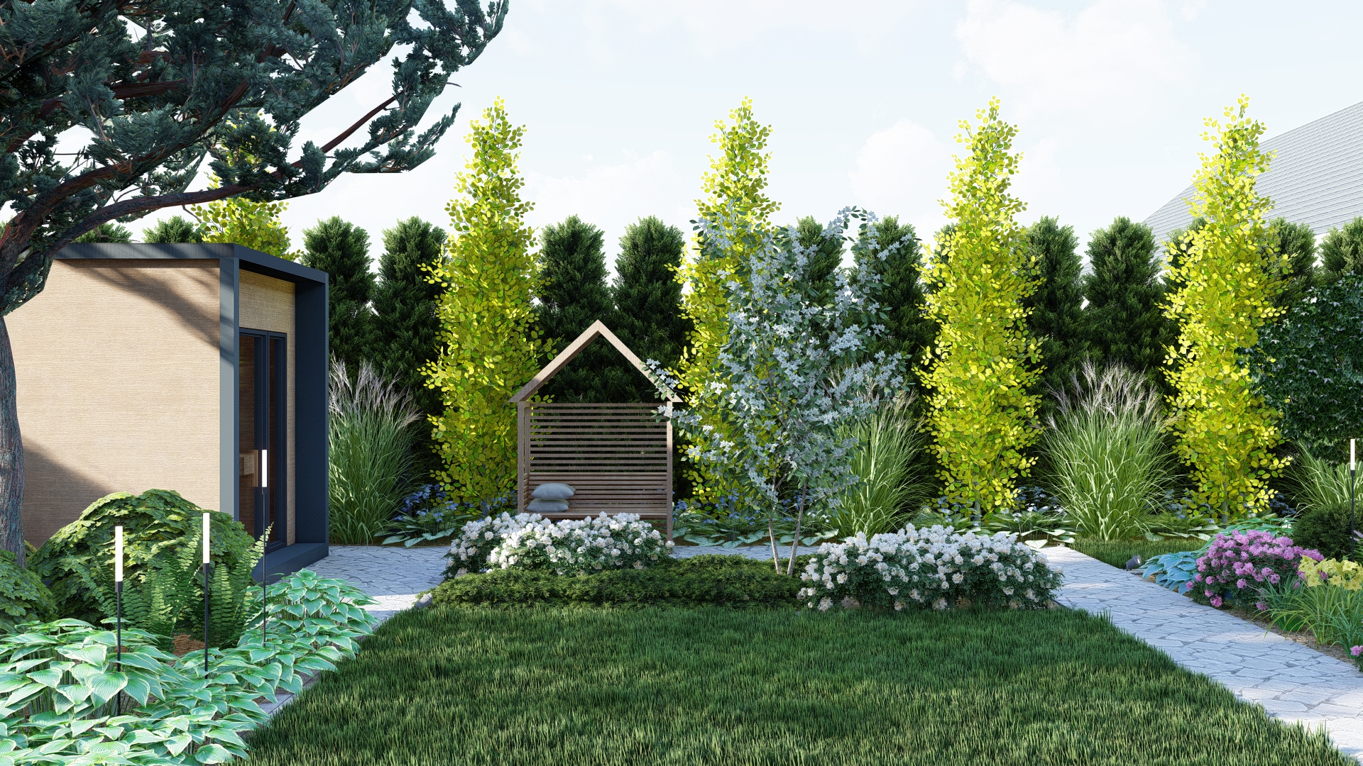 Mała architektura dopasowana do budynku – ławka, domek ogrodnika i sauna w spójnej stylistyce.