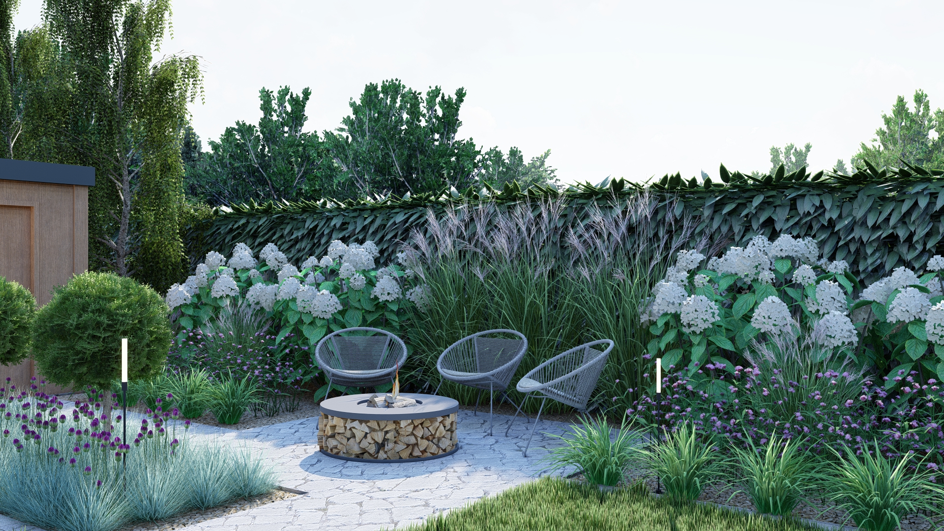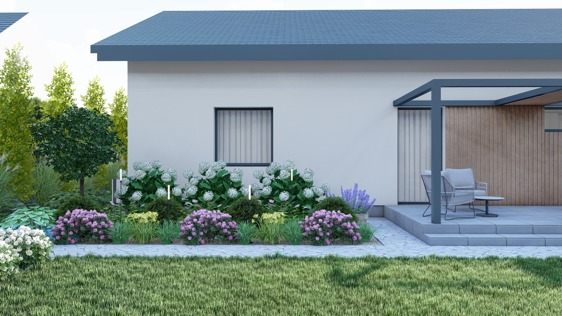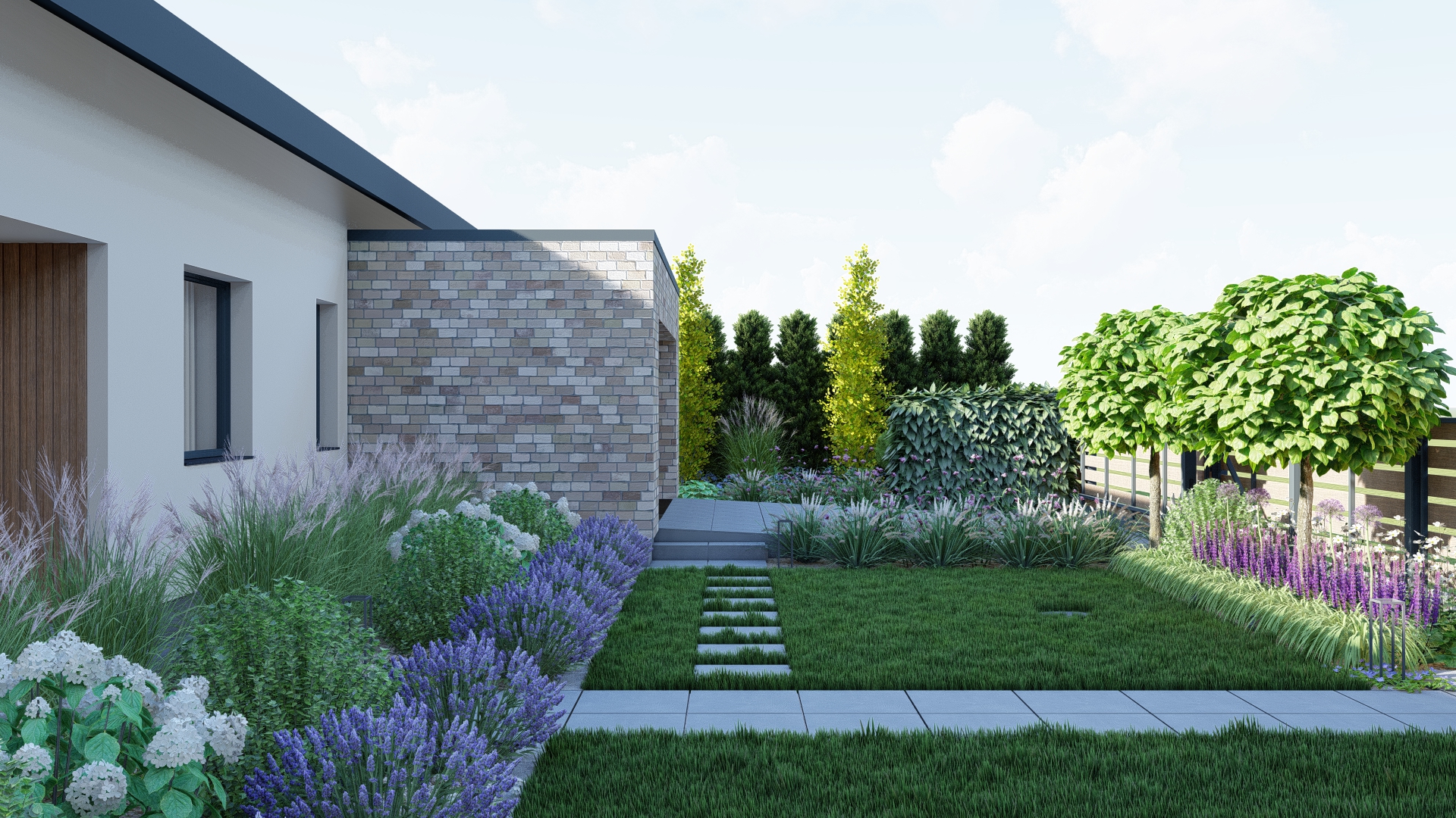 Projekt ogrodu łączy atrakcyjność przez cały rok z minimalnym nakładem pracy potrzebnym do pielęgnacji. W aranżacji wykorzystano istniejące gatunki roślin oraz nowe nasadzenia w stonowanej kolorystyce zieleni, bieli i fioletu, które tworzą spokojną i harmonijną przestrzeń.