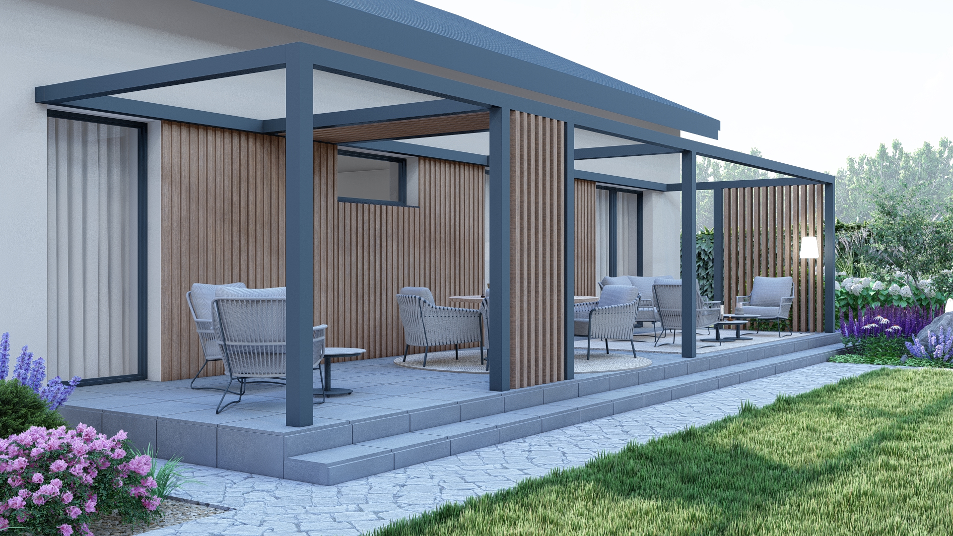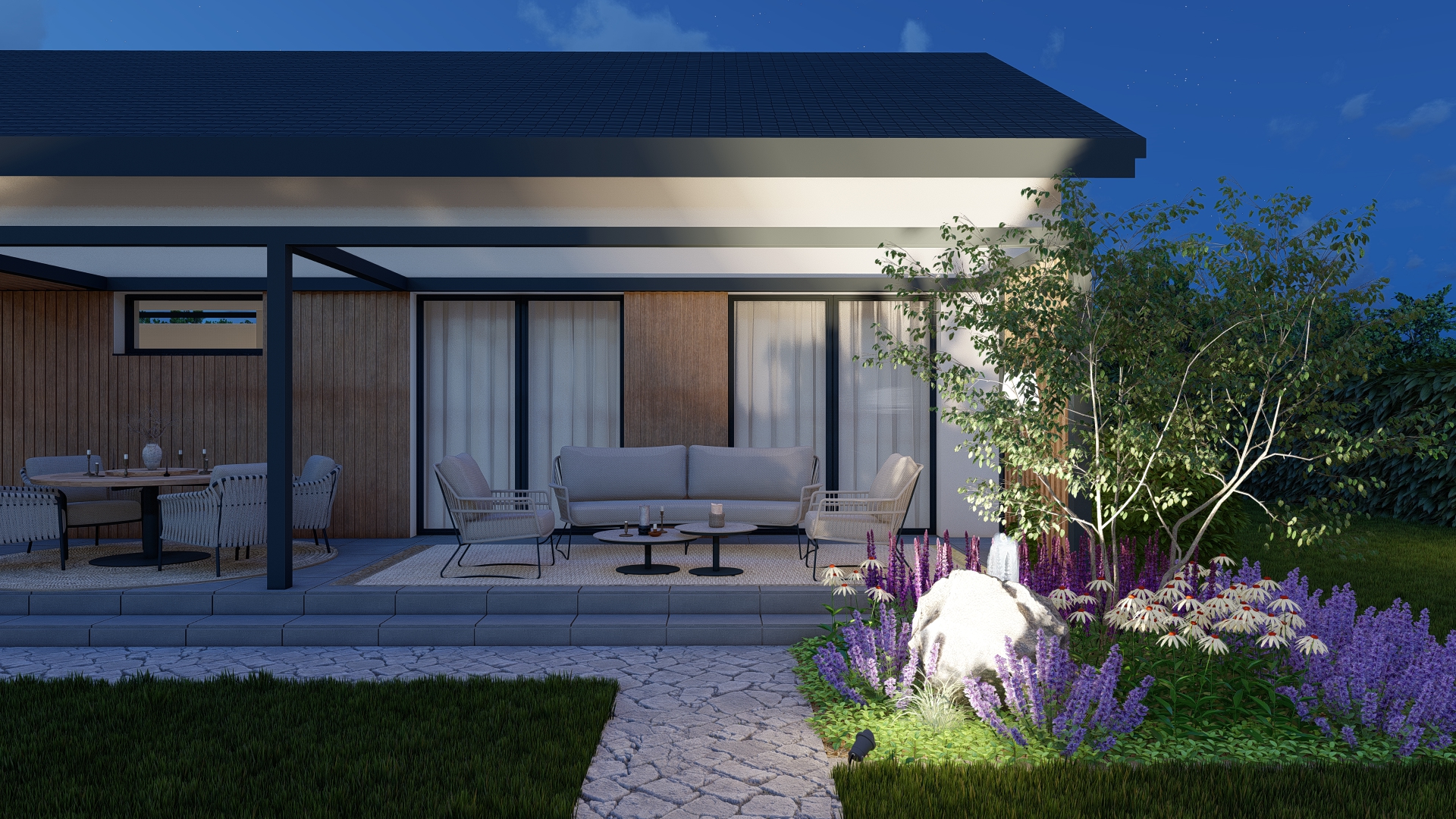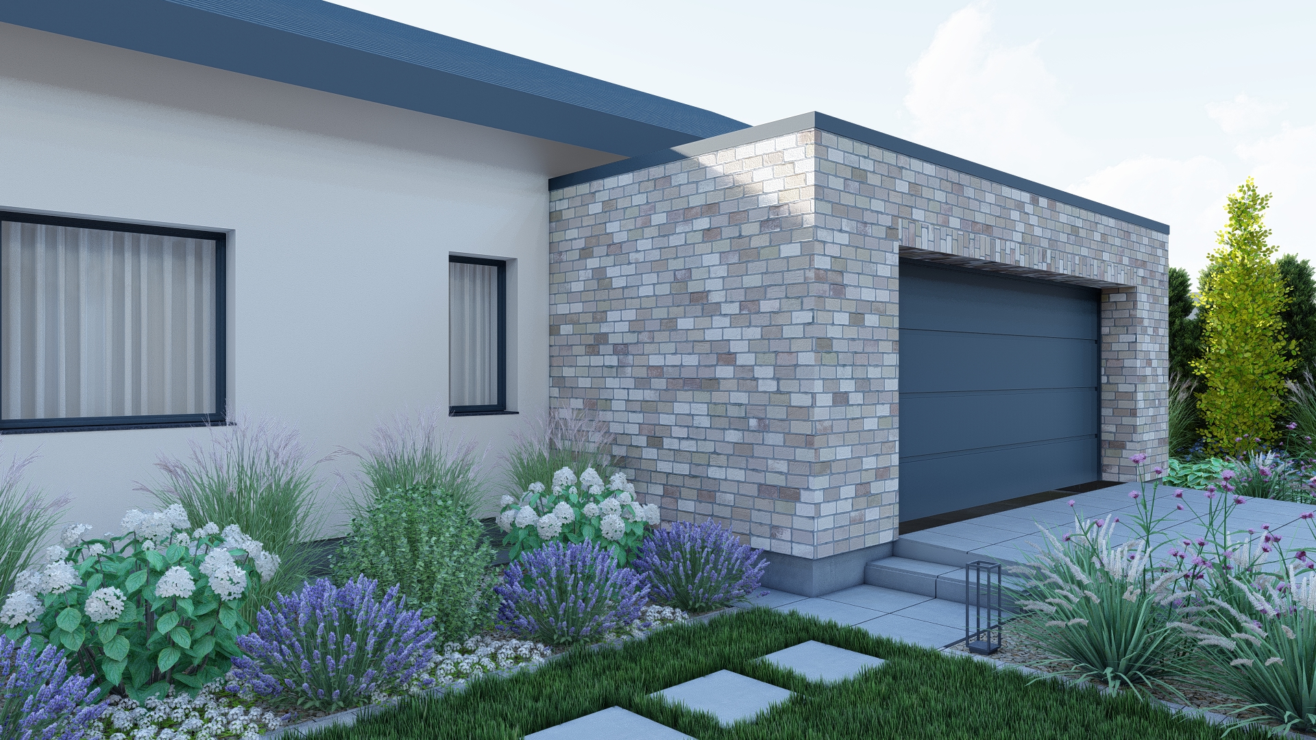 Projekt ogrodu łączy atrakcyjność przez cały rok z minimalnym nakładem pracy potrzebnym do pielęgnacji. W aranżacji wykorzystano istniejące gatunki roślin oraz nowe nasadzenia w stonowanej kolorystyce zieleni, bieli i fioletu, które tworzą spokojną i harmonijną przestrzeń.