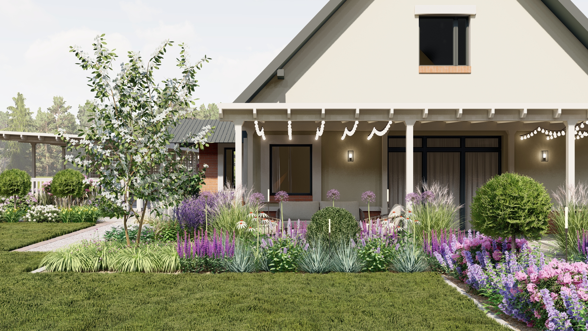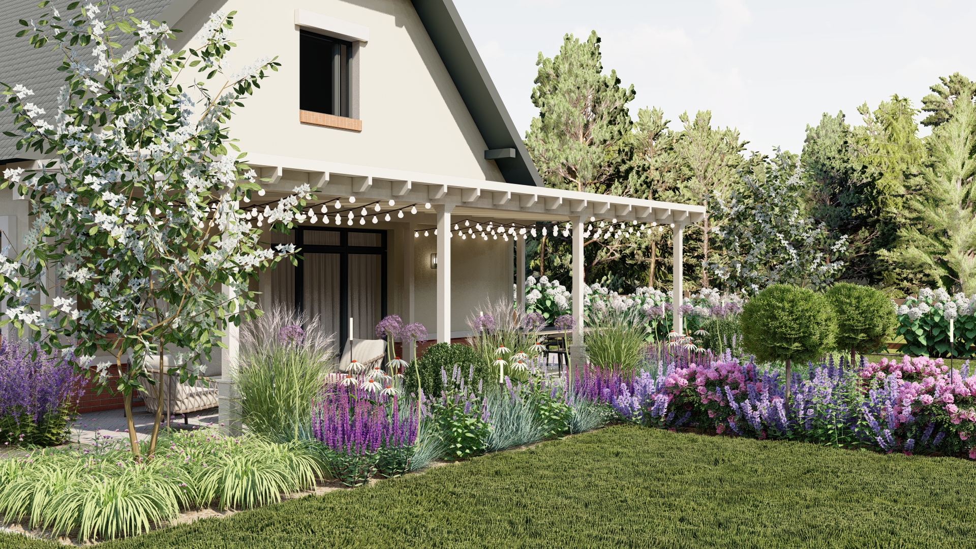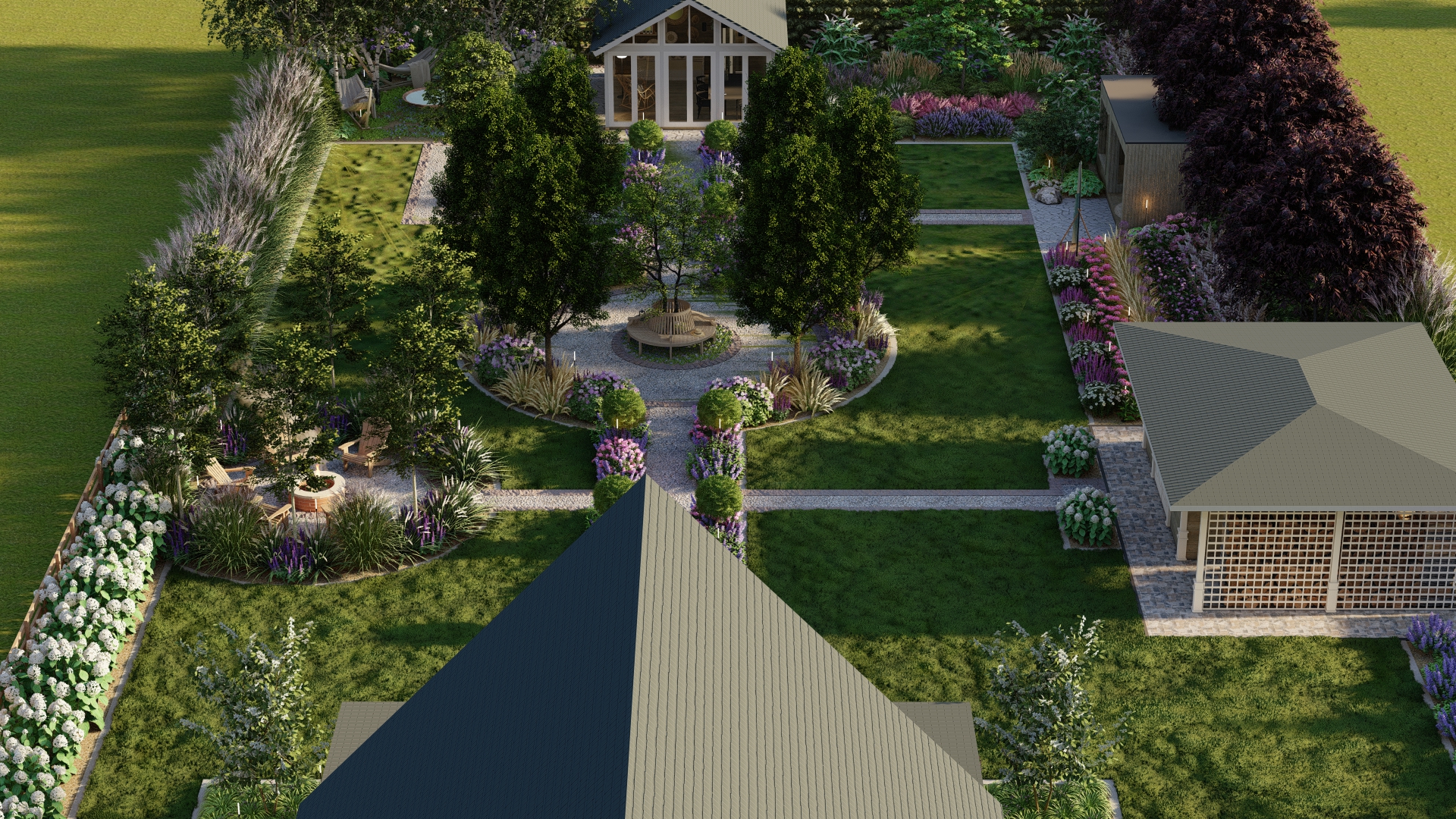 Projekt łączy klasyczną formę ogrodu formalnego z delikatnymi akcentami naturalistycznymi, tworząc przestrzeń atrakcyjną przez cały rok, z intensywnym kwitnieniem w okresie wegetacyjnym. Ogród harmonijnie integruje elementy użytkowe i rekreacyjne, zapewniając prywatność i komfort mieszkańcom.