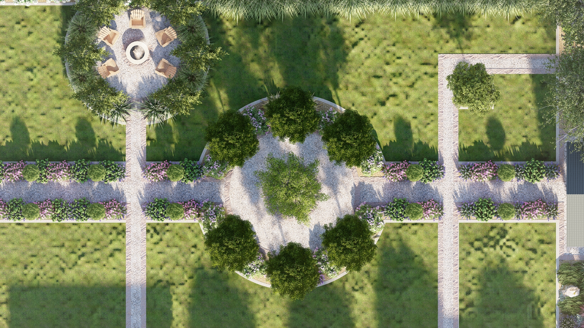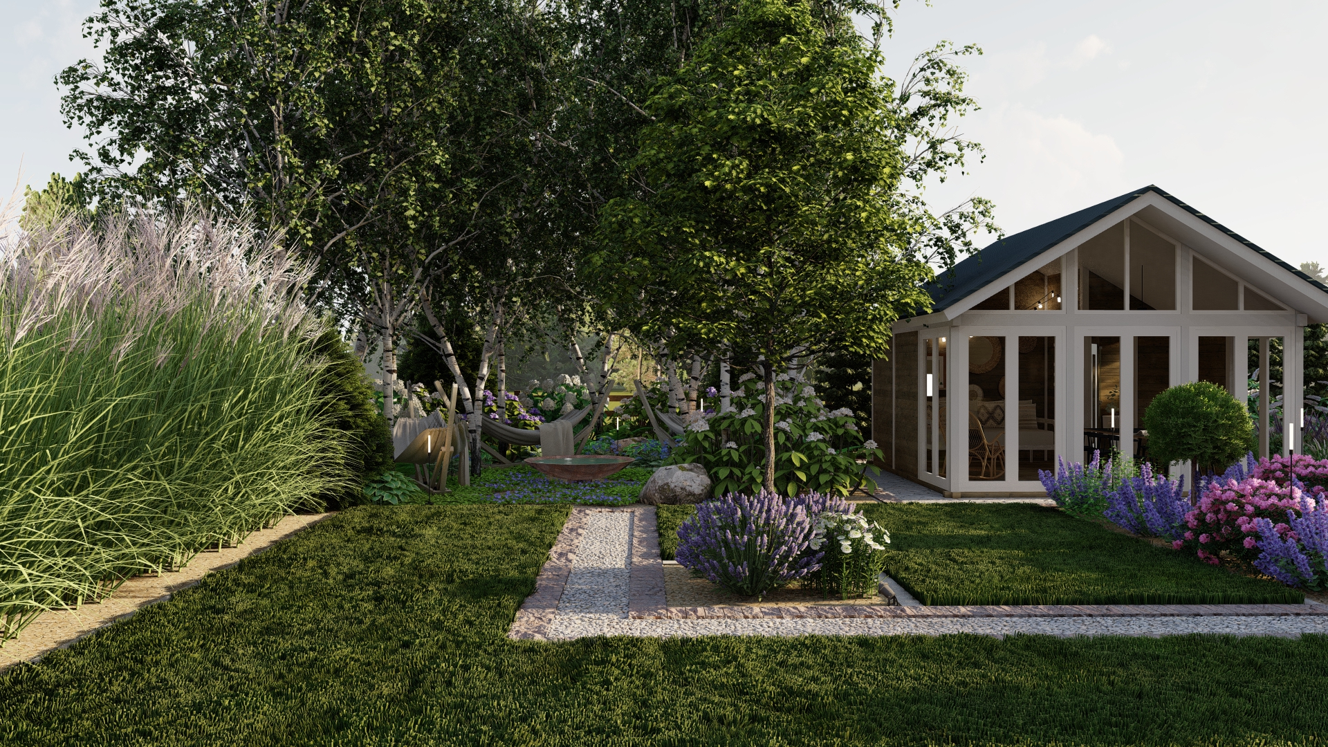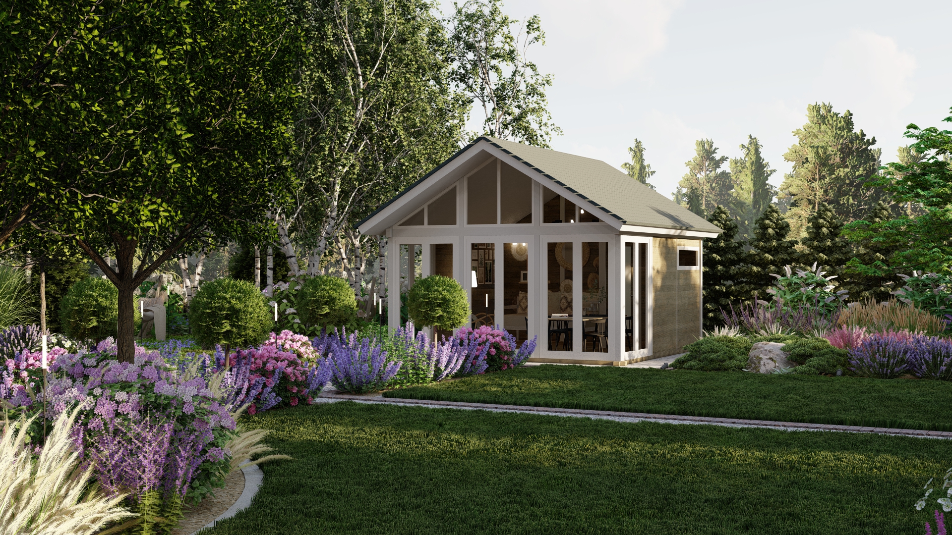 Projekt łączy klasyczną formę ogrodu formalnego z delikatnymi akcentami naturalistycznymi, tworząc przestrzeń atrakcyjną przez cały rok, z intensywnym kwitnieniem w okresie wegetacyjnym. Ogród harmonijnie integruje elementy użytkowe i rekreacyjne, zapewniając prywatność i komfort mieszkańcom.