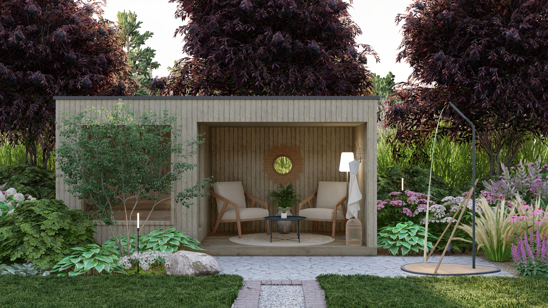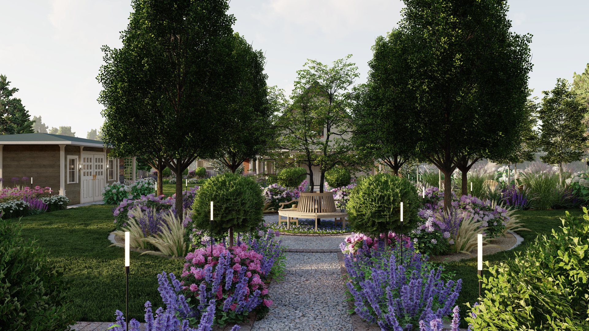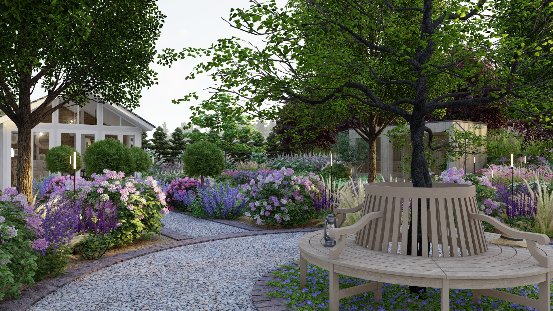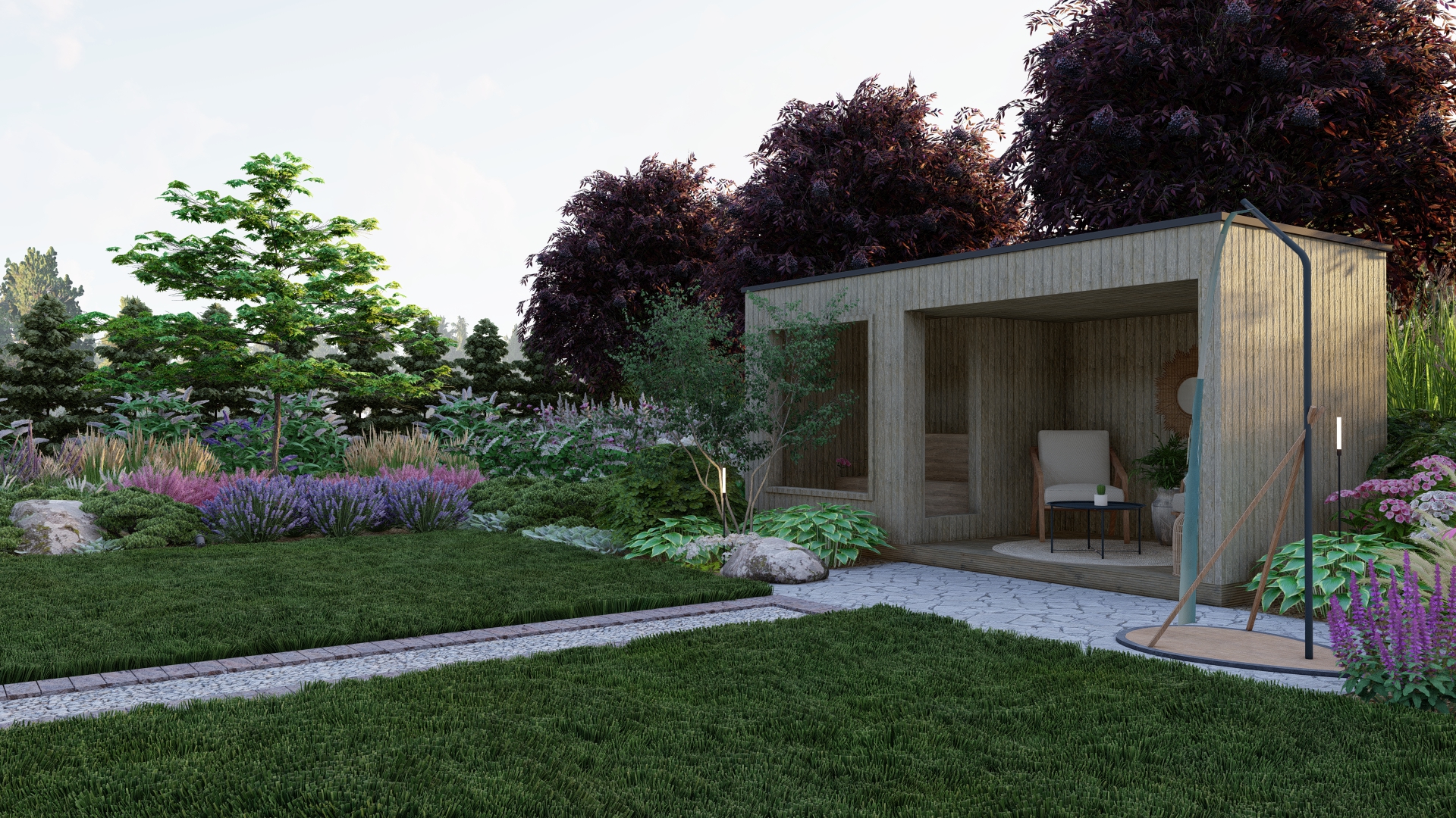 Propozycja oświetlenia ogrodu – podkreśla strukturę ogrodu i roślinność po zmroku.