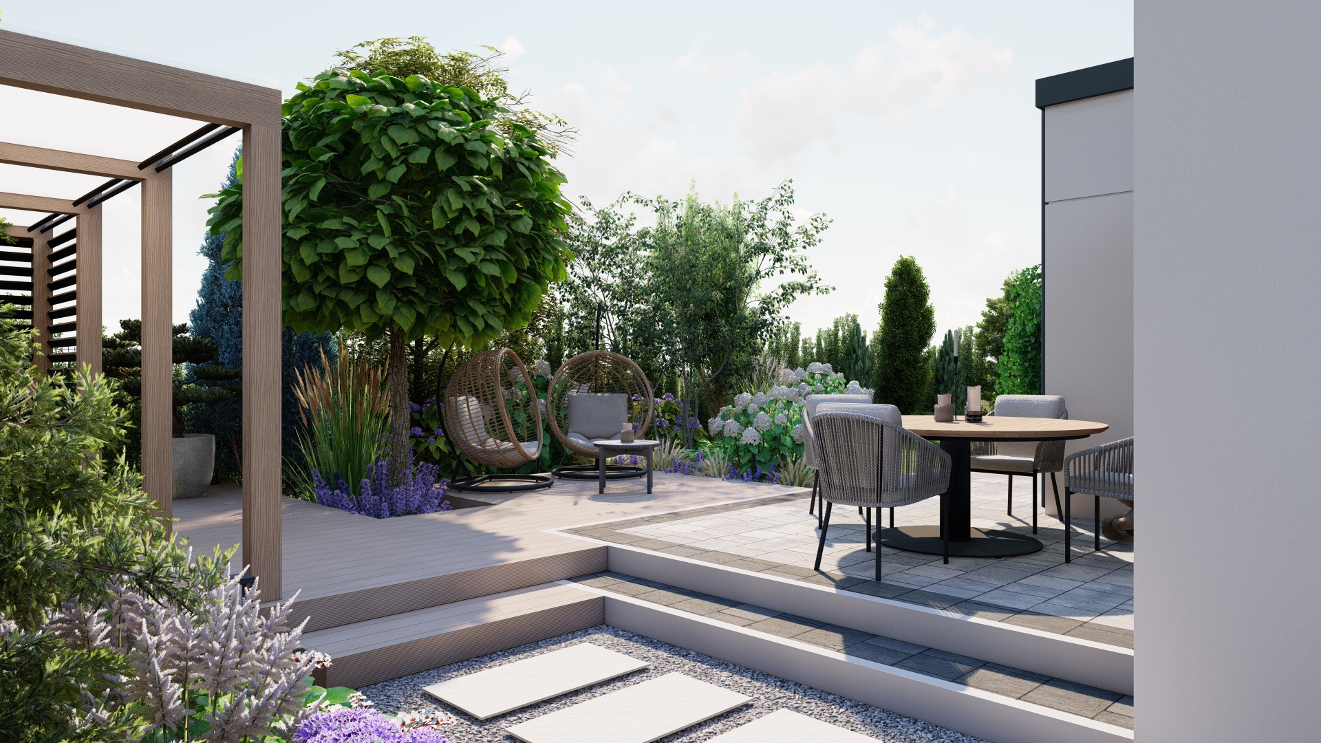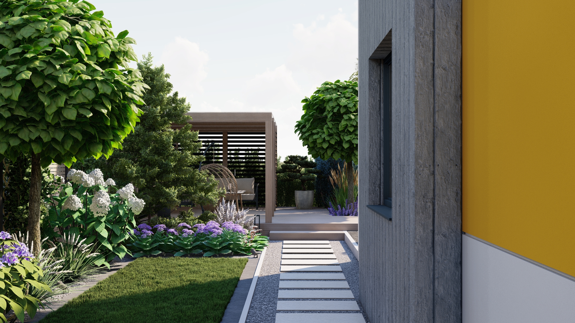 Zapewnienie prywatności – nasadzenia i elementy architektury zapewniają osłonę od sąsiadów i ulicy.