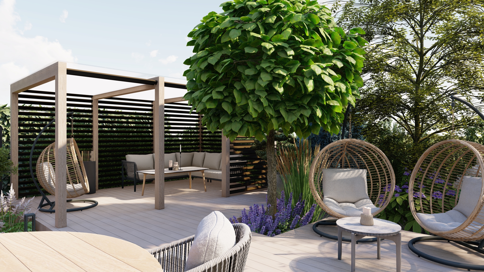 Podział stref tarasu – wydzielone strefy relaksu i jadalni ogrodowej dla komfortu użytkowników.