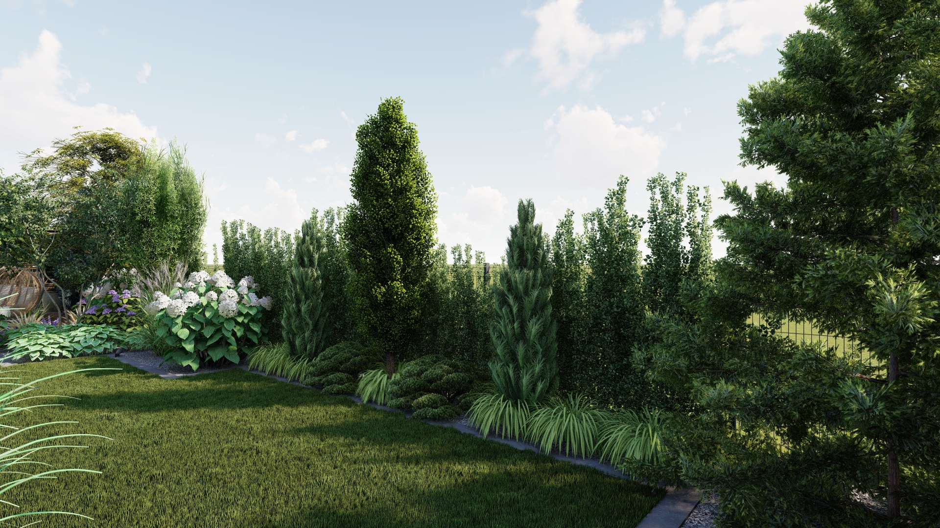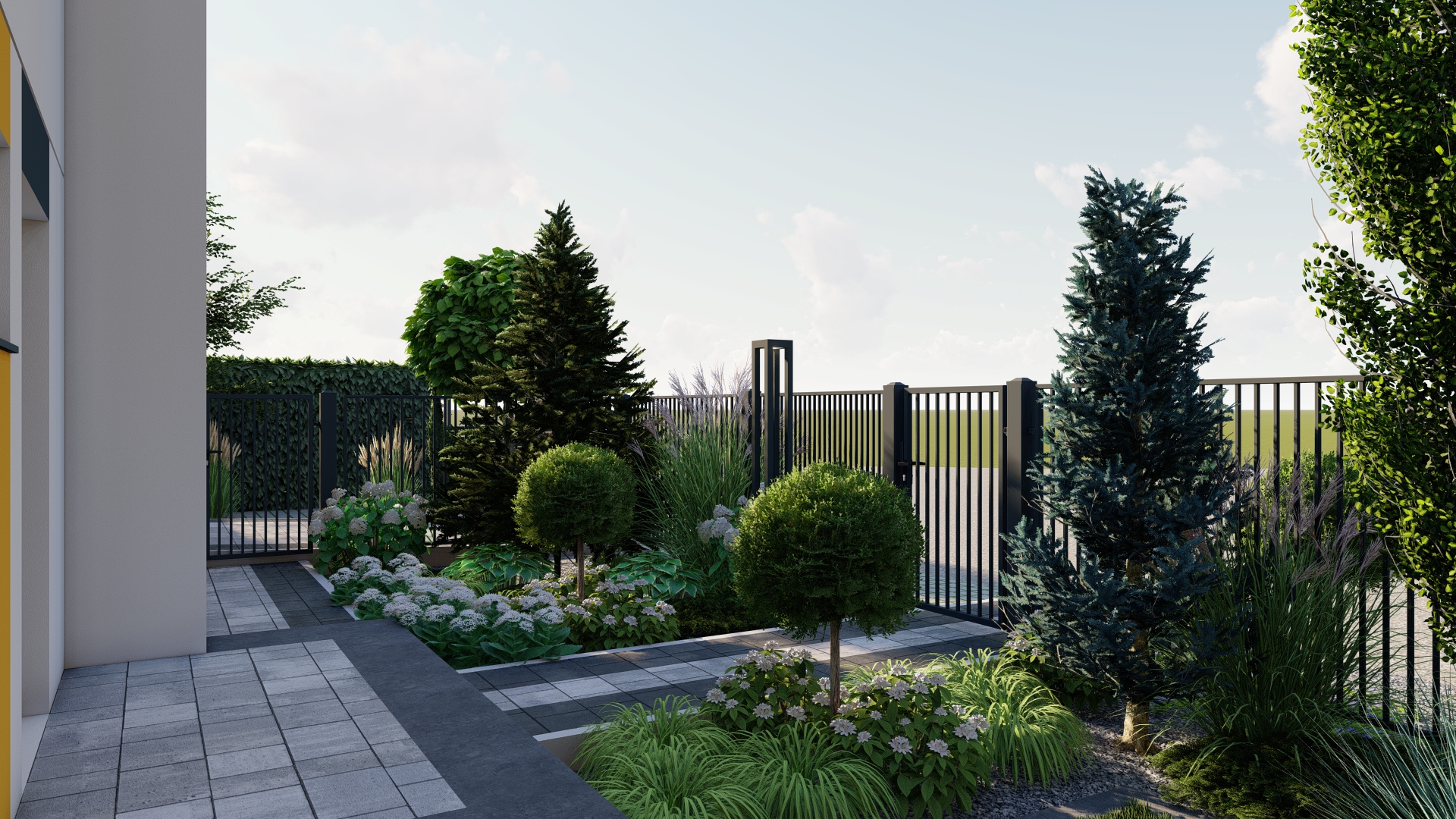 Styl formalny z akcentami naturalistycznymi – elegancja geometrii uzupełniona miękkimi, swobodnymi rabatami.