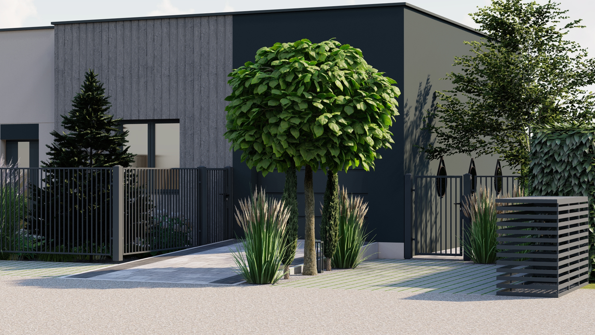 Wydzielenie strefy przechowywania odpadów – funkcjonalne rozwiązanie wkomponowane w ogrodową przestrzeń.