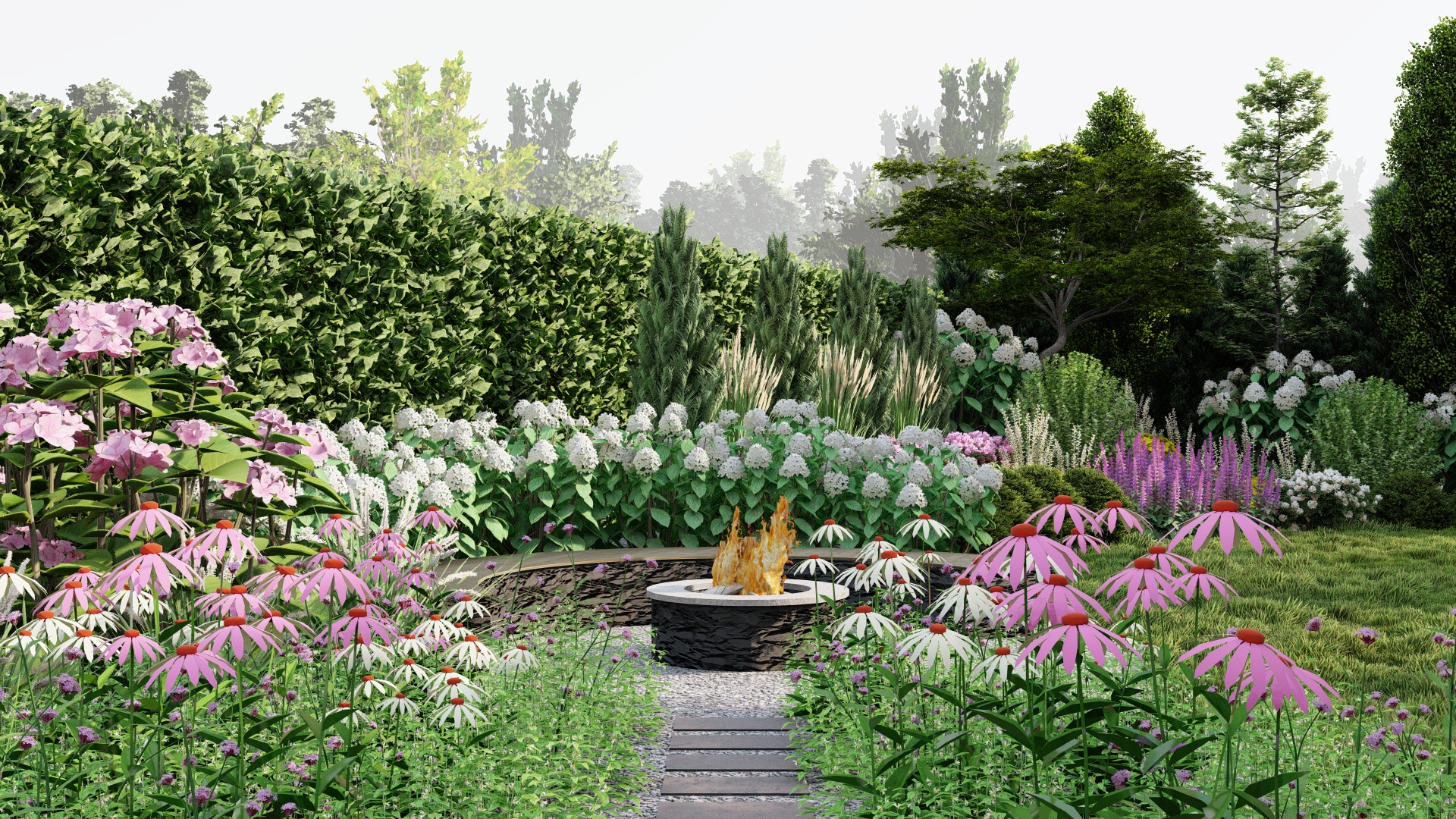 Projekt ogrodu leśnego z paleniskiem i rabatą ziołową – styl swobodny