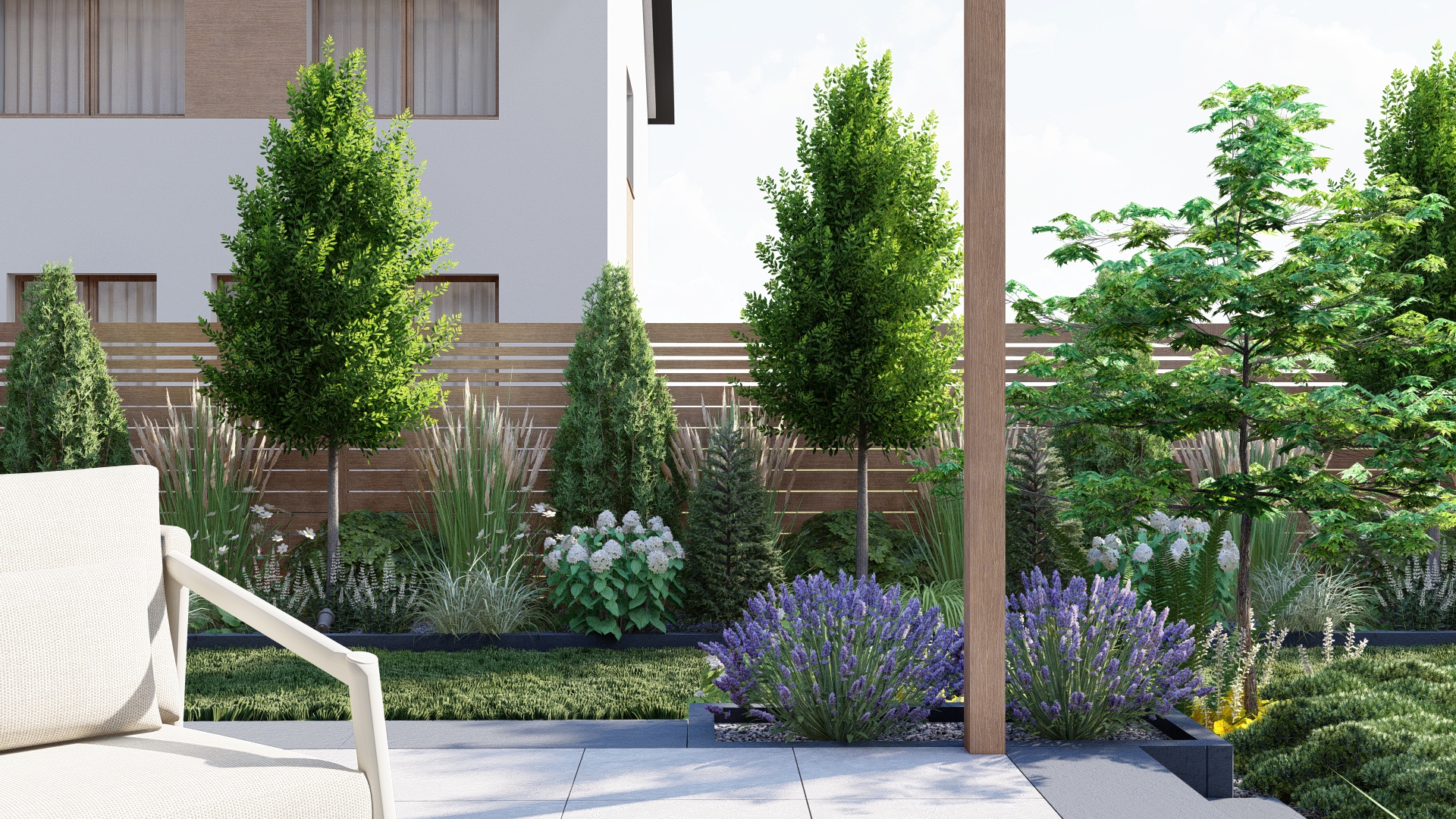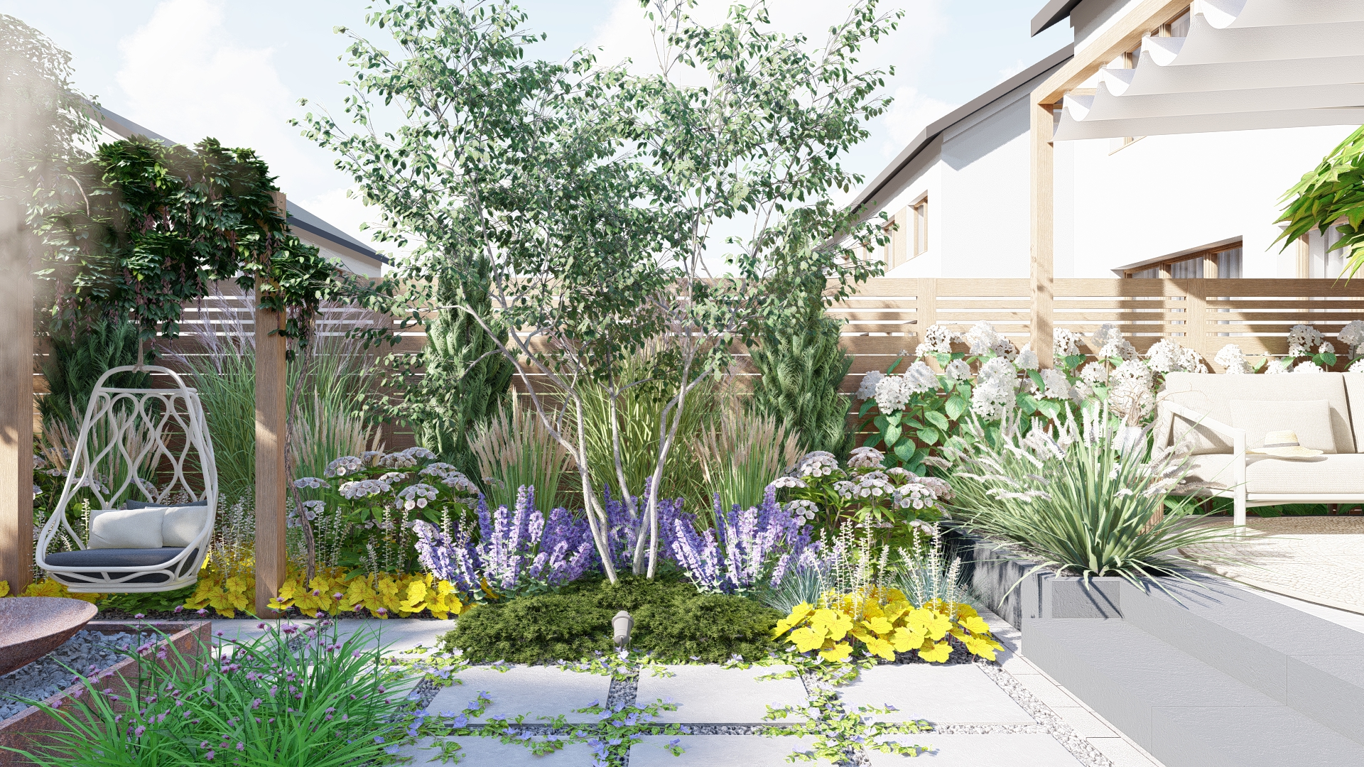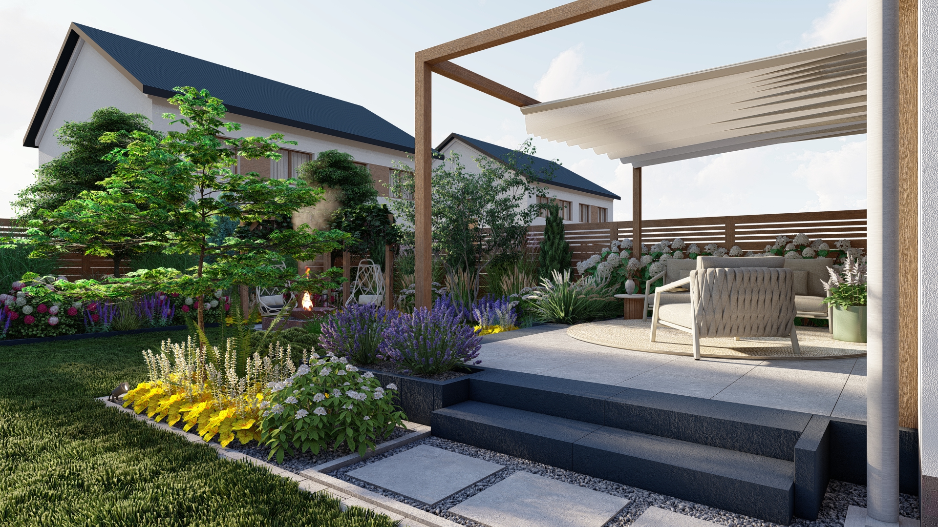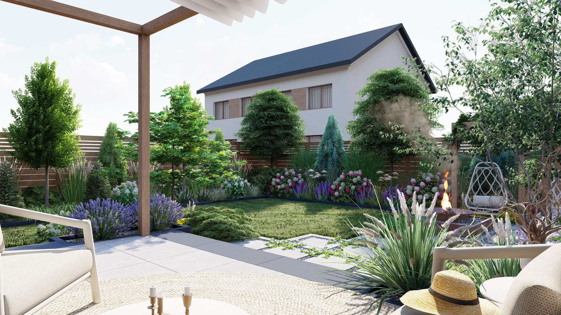 To ogród, w którym każdy detal został zaprojektowany z myślą o komforcie użytkowników i ponadczasowym wyglądzie.