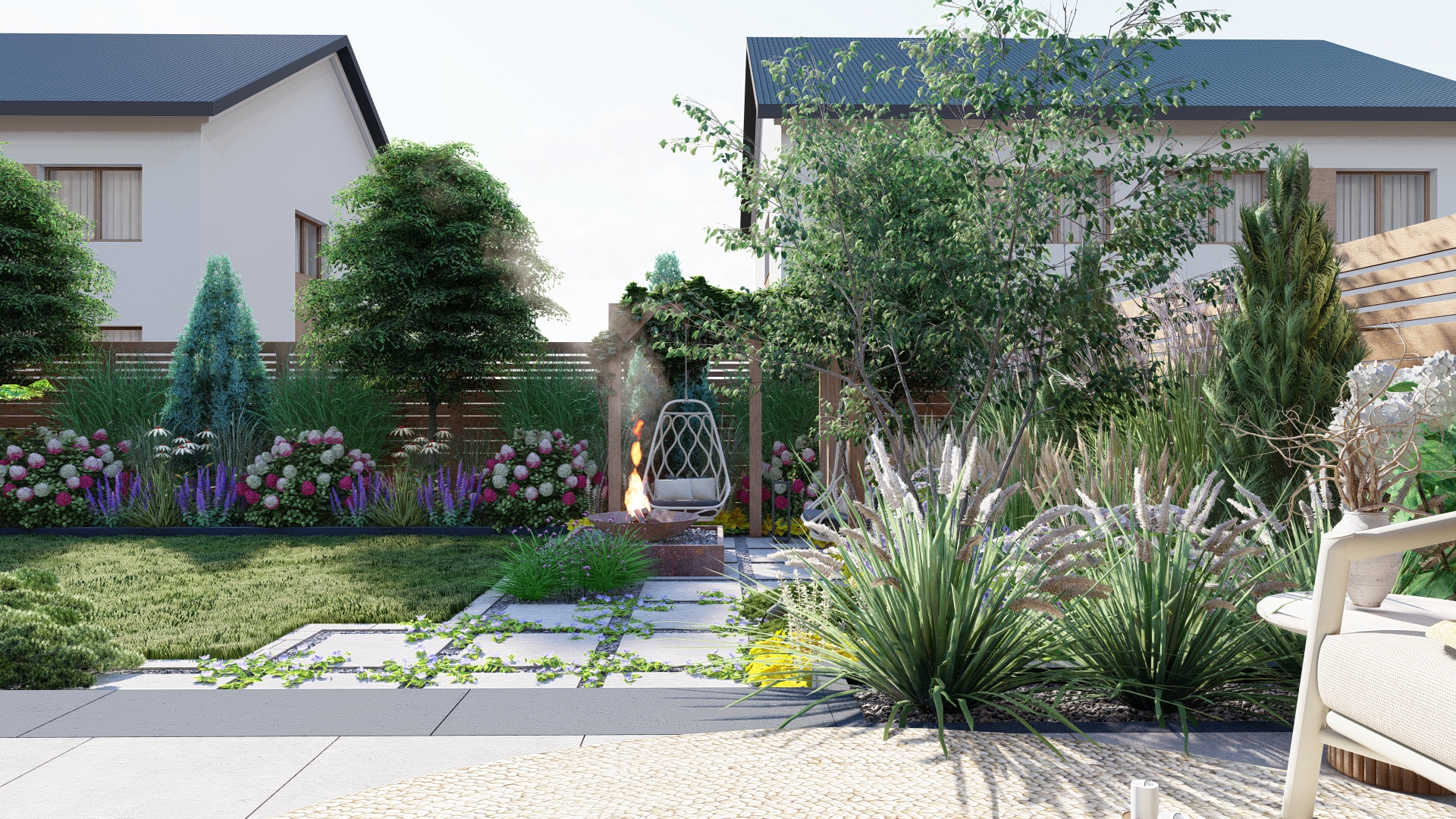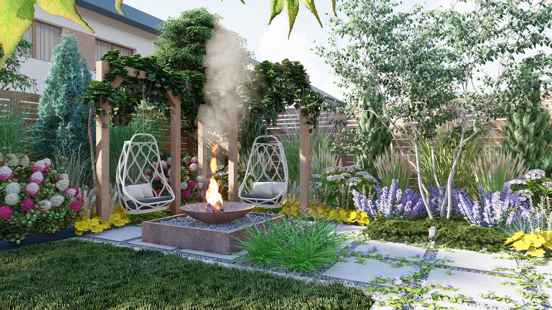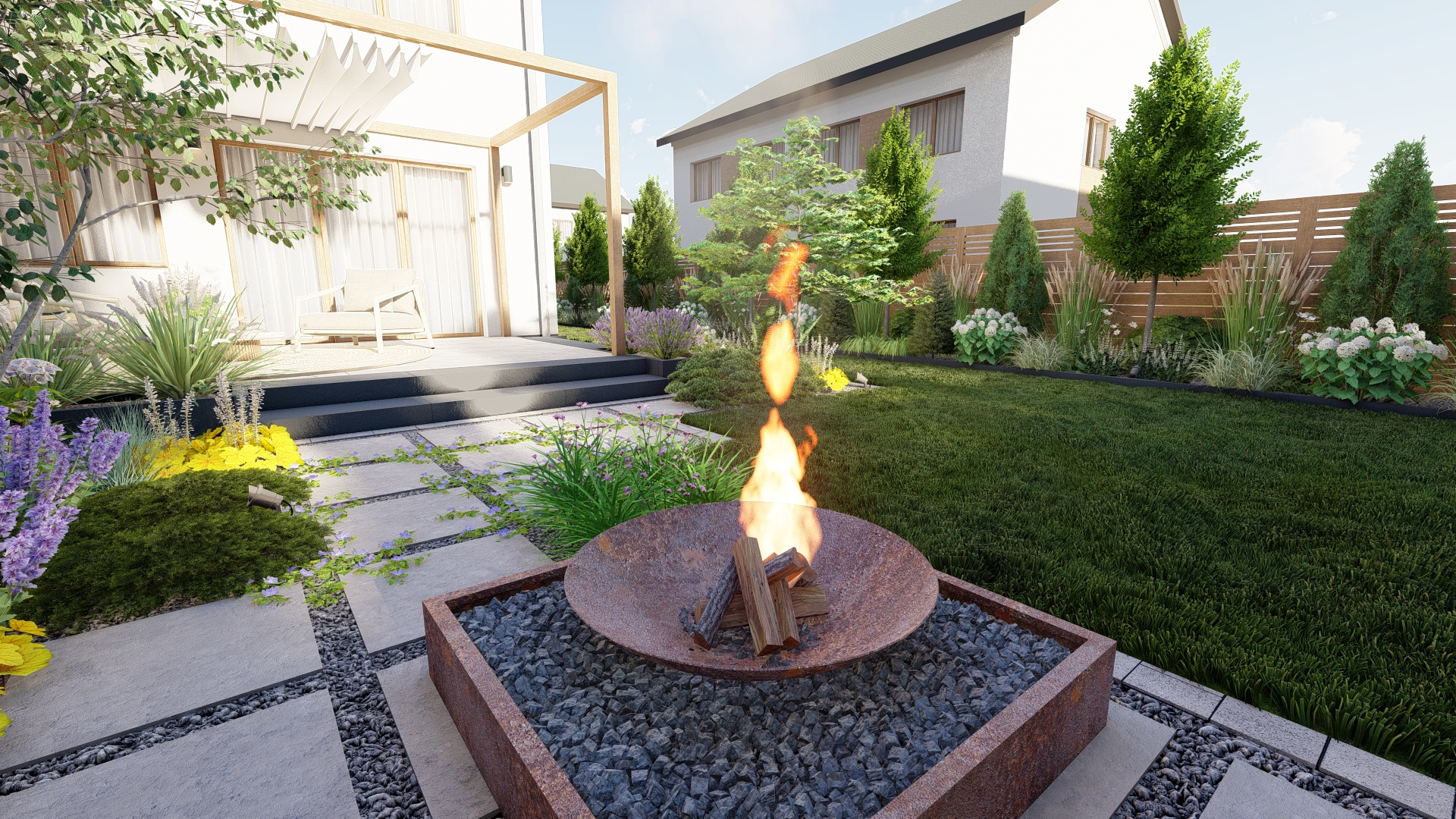 Ogród nowoczesny z paleniskiem – elegancja w zieleni, bieli i fiolecie