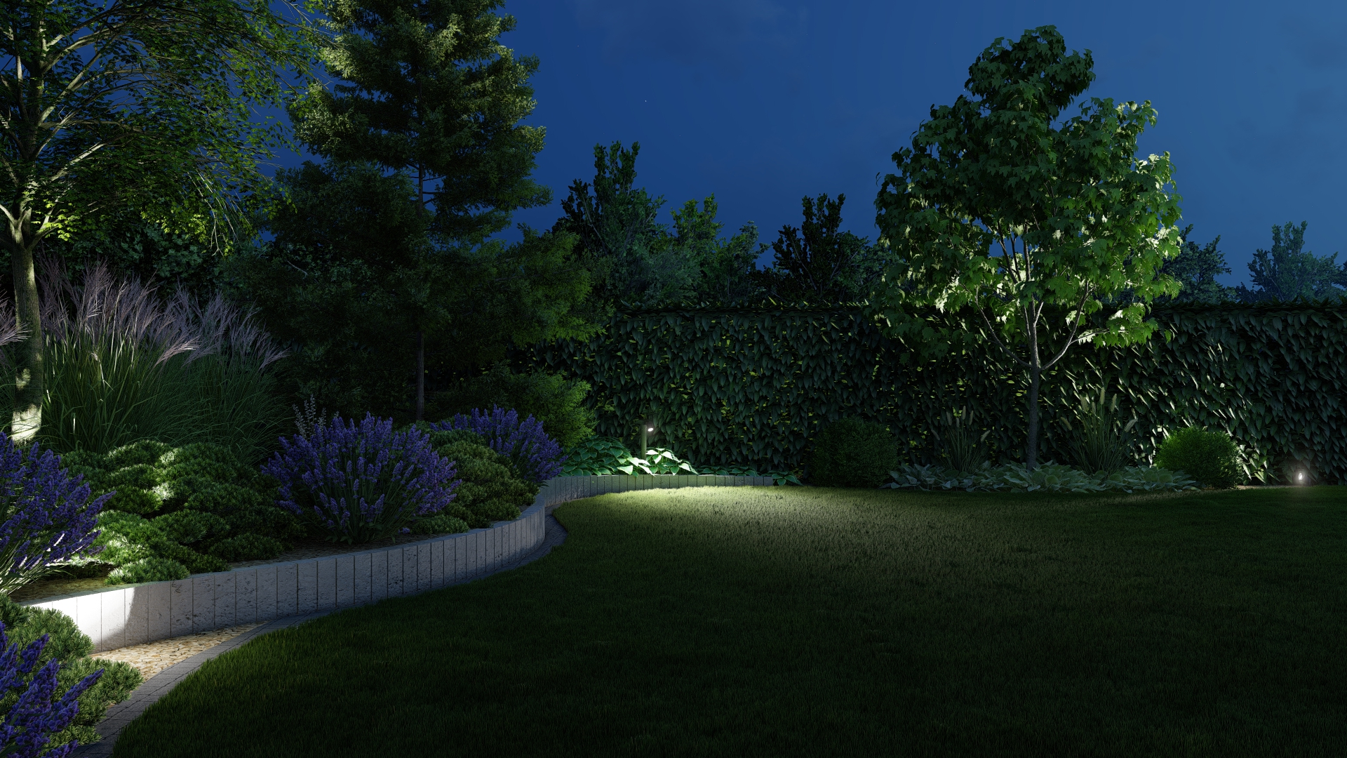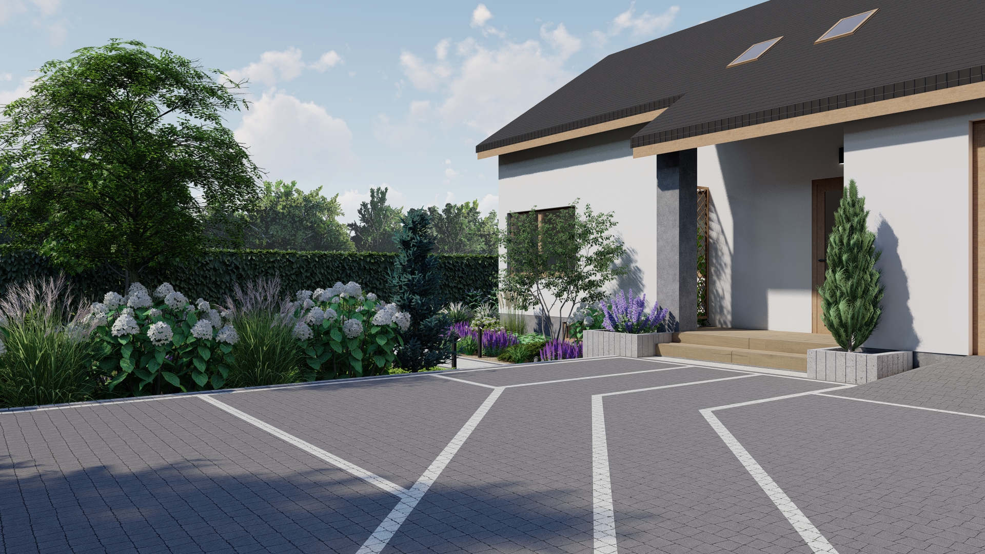 • Projekt zapewnia poczucie prywatności, dzięki odpowiedniemu rozmieszczeniu zieleni i elementów architektury ogrodowej.