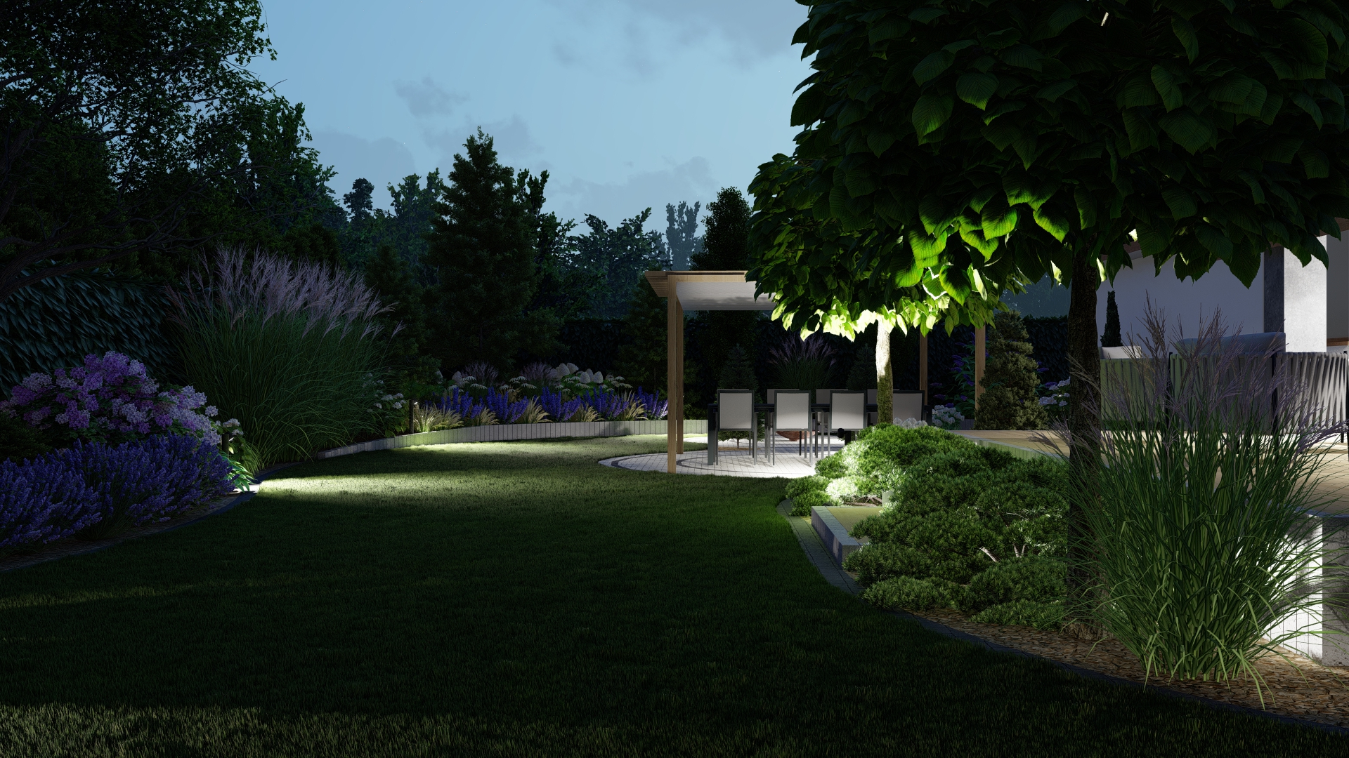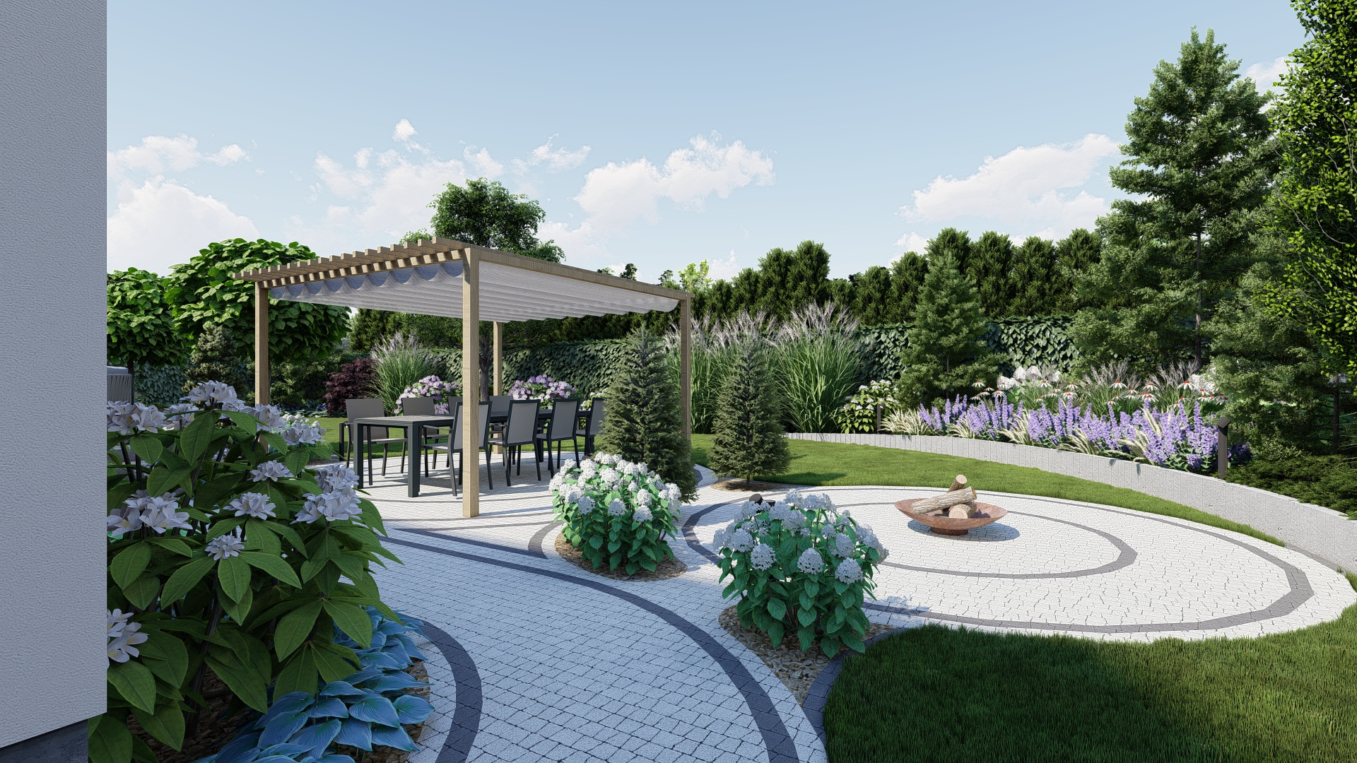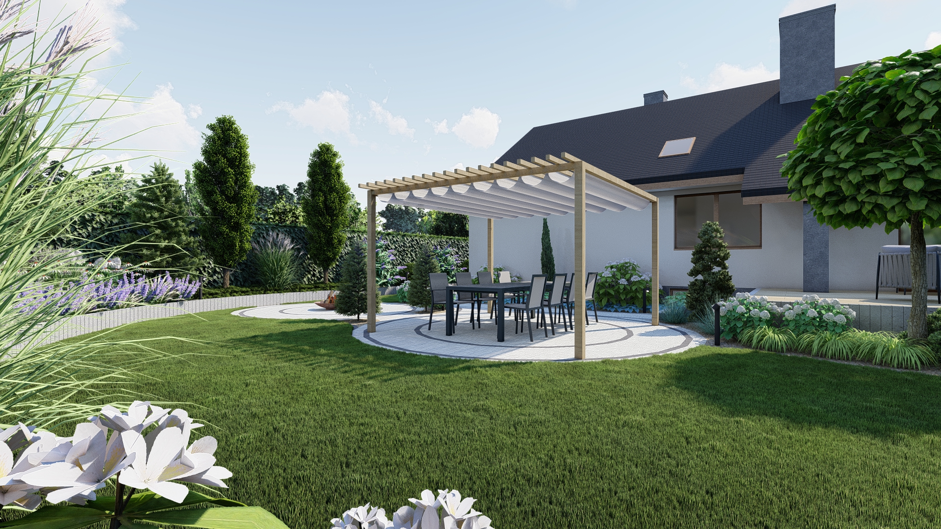 Projekt zakłada stworzenie wielofunkcyjnej, przyjaznej przestrzeni, która łączy estetykę z komfortem użytkowania przez cały rok. Kompozycja utrzymana została w swobodnym, nieformalnym stylu, idealnie wpisującym się w naturalne otoczenie.