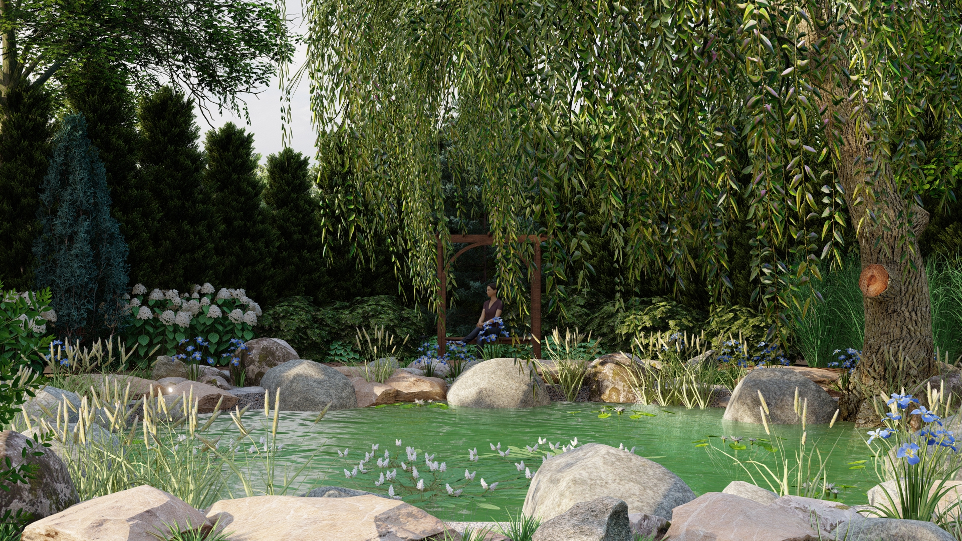 Aranżacja otoczenia istniejącego stawu – kluczowy element kompozycji całego ogrodu.