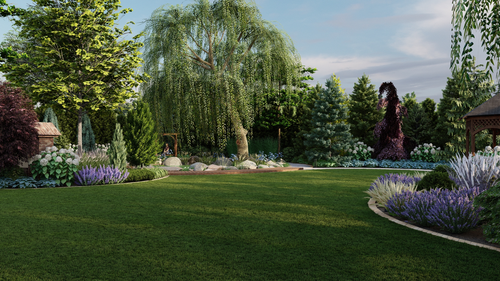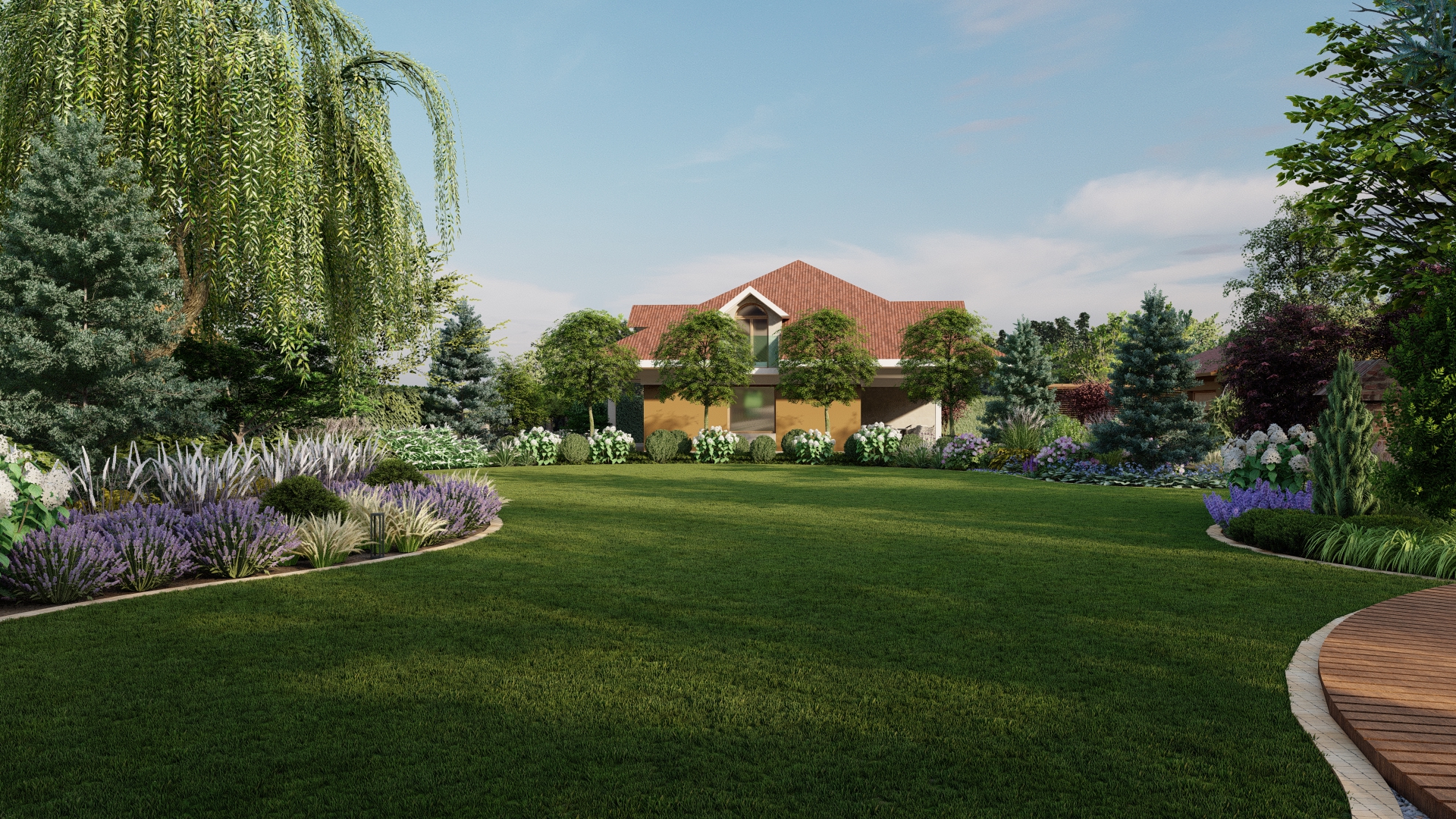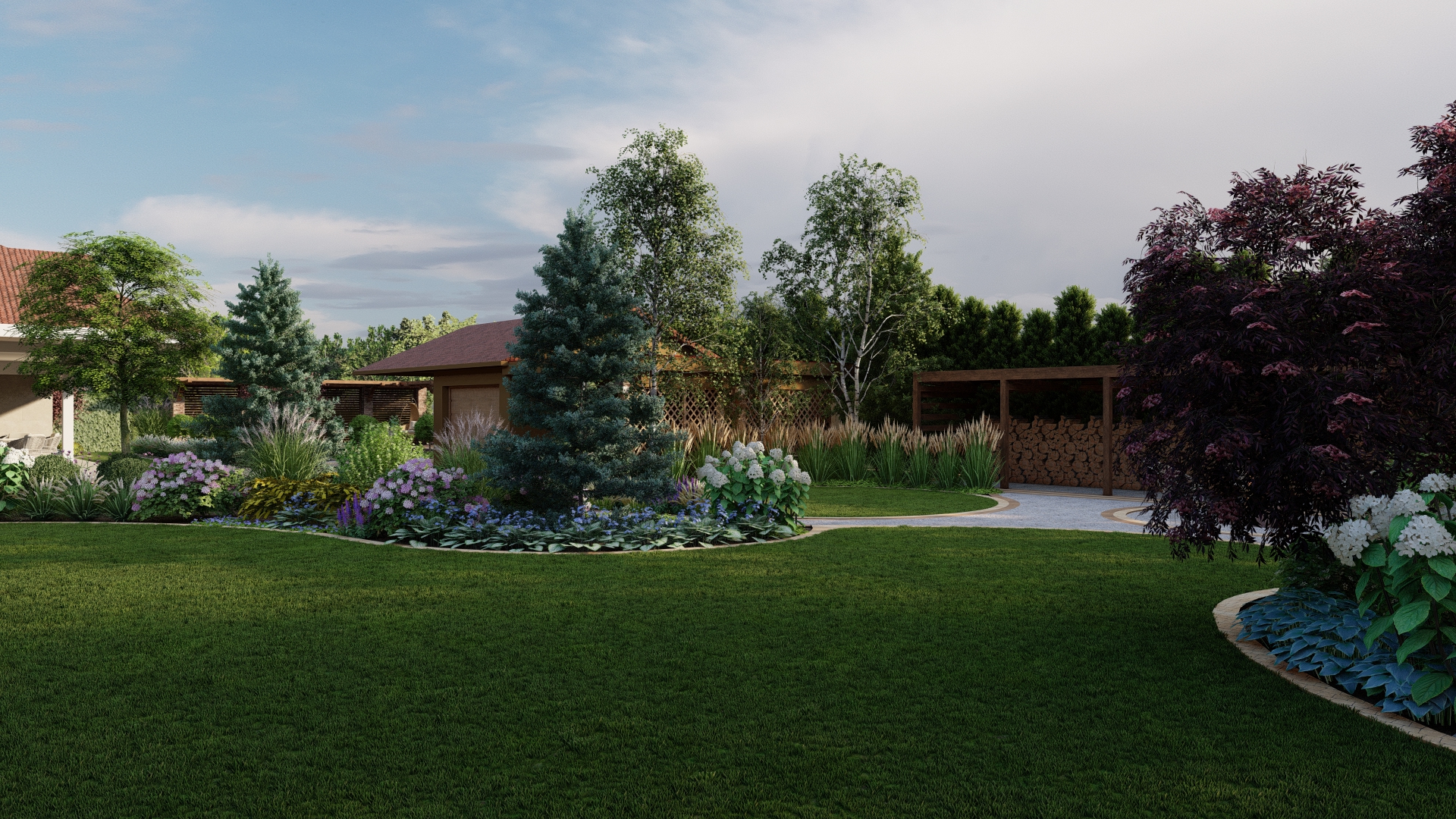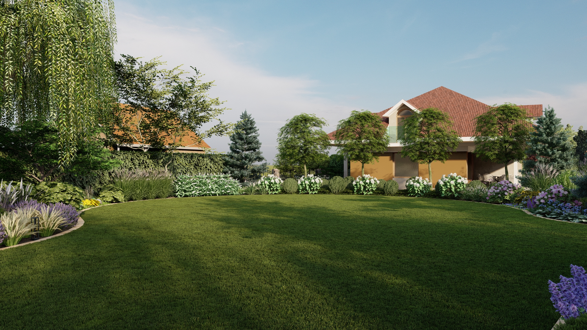 Projekt ogrodu ze stawem koncentruje się na stworzeniu spokojnej, eleganckiej i łatwej w utrzymaniu przestrzeni, która zachwyca o każdej porze roku. Stonowana kolorystyka roślin, przełamana delikatnymi akcentami bieli i fioletu, buduje naturalną równowagę i podkreśla uporządkowany charakter ogrodu.