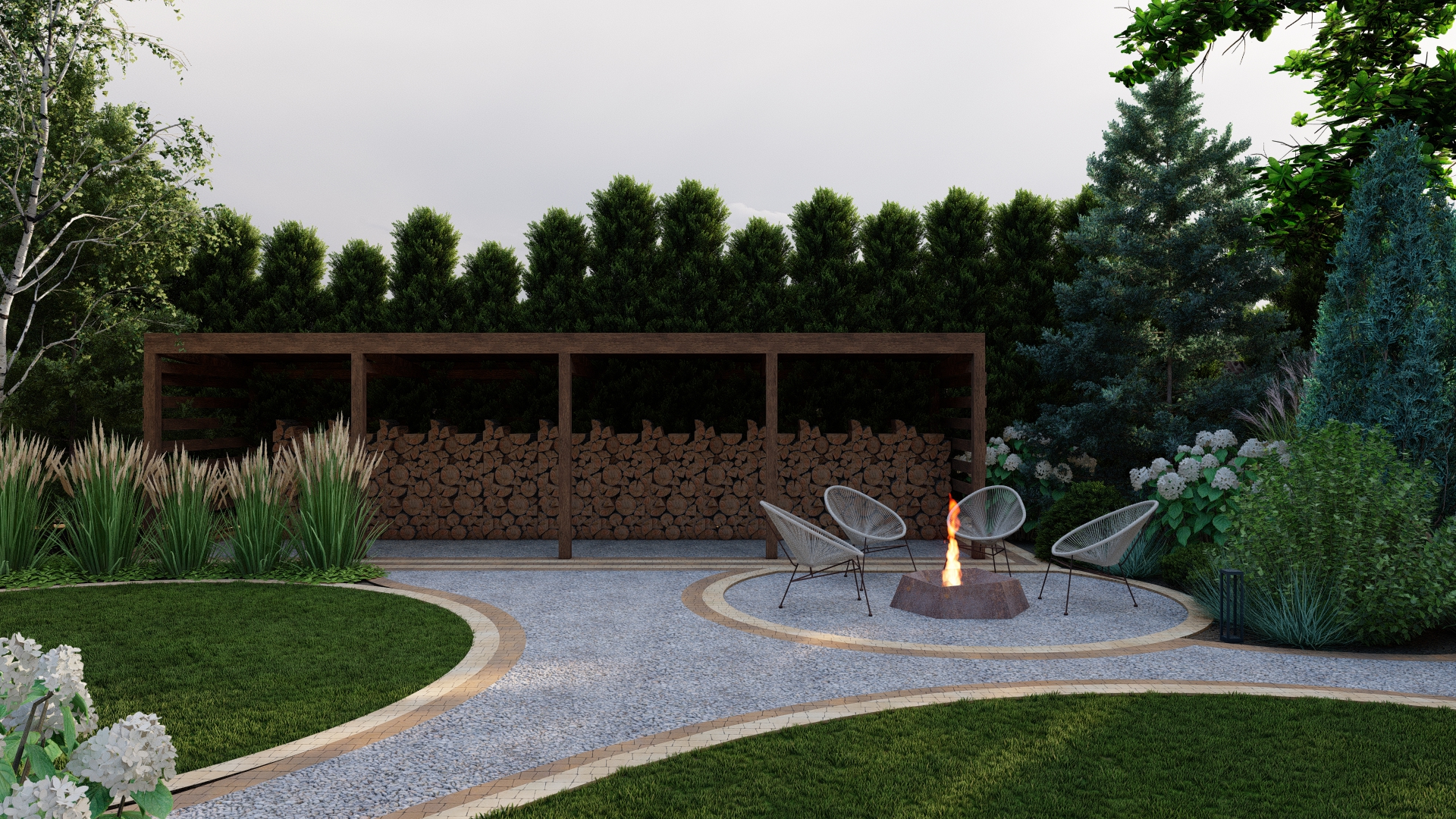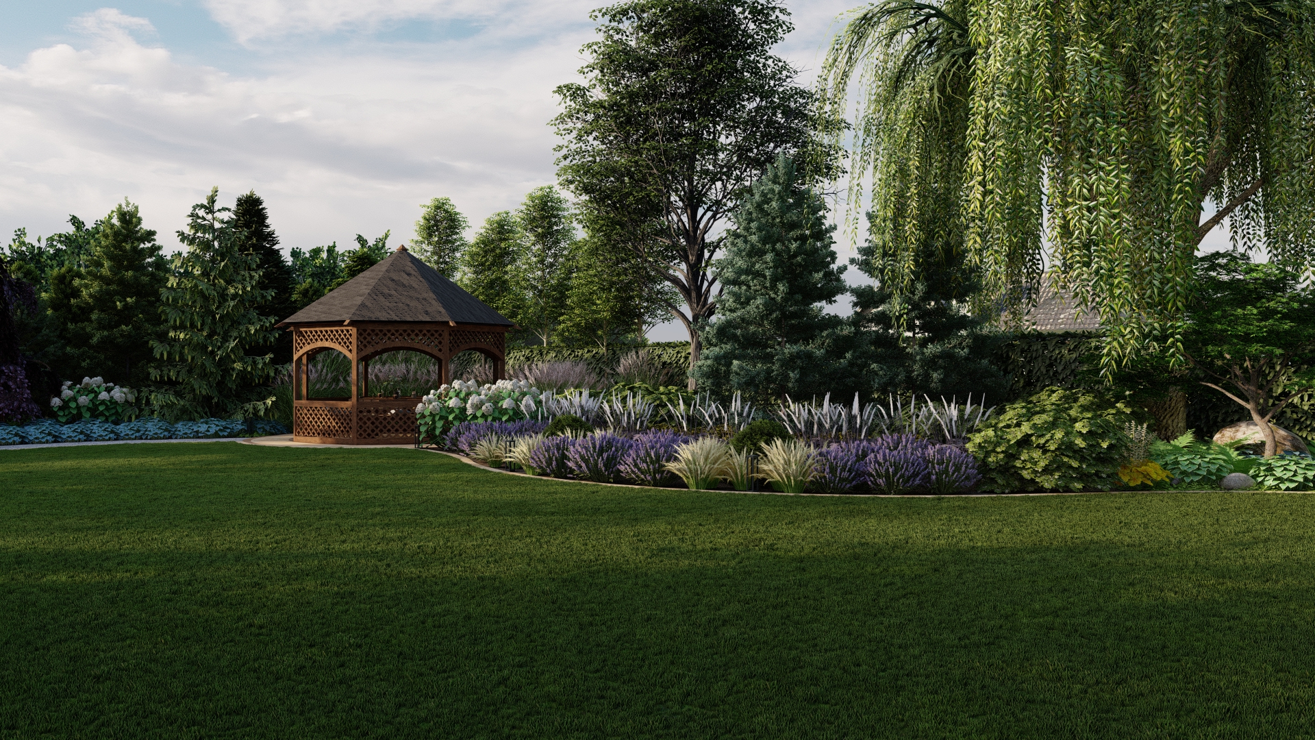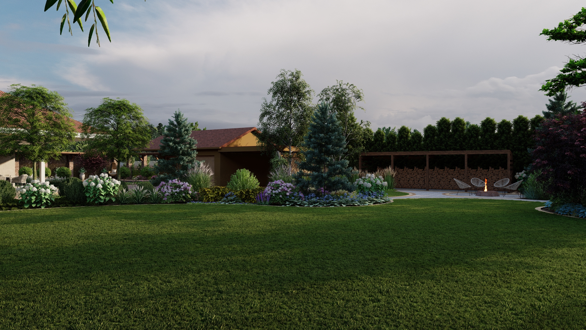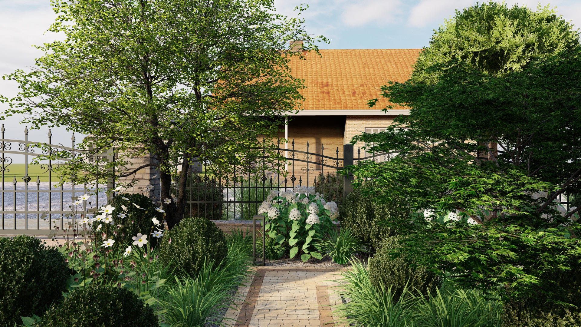 Projekt ogrodu ze stawem koncentruje się na stworzeniu spokojnej, eleganckiej i łatwej w utrzymaniu przestrzeni, która zachwyca o każdej porze roku. Stonowana kolorystyka roślin, przełamana delikatnymi akcentami bieli i fioletu, buduje naturalną równowagę i podkreśla uporządkowany charakter ogrodu.