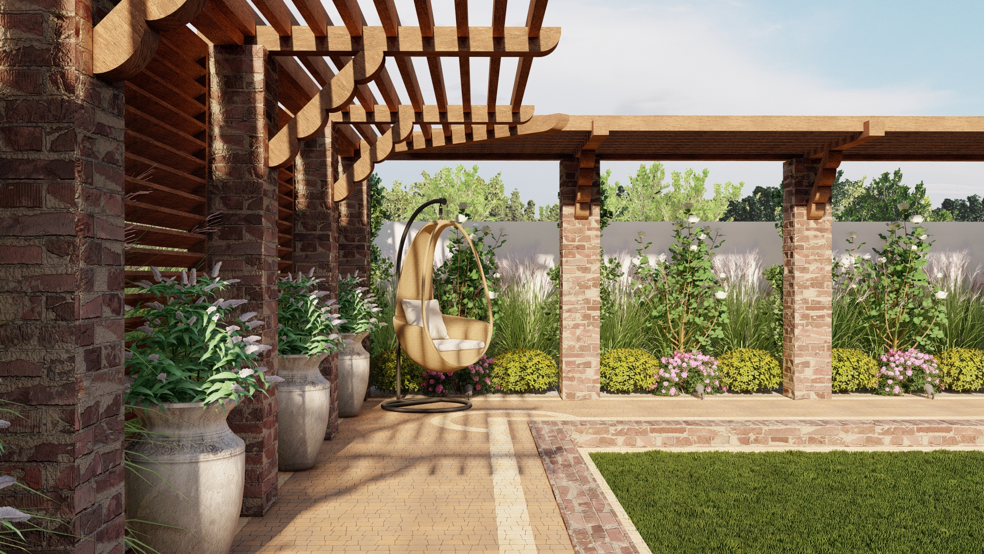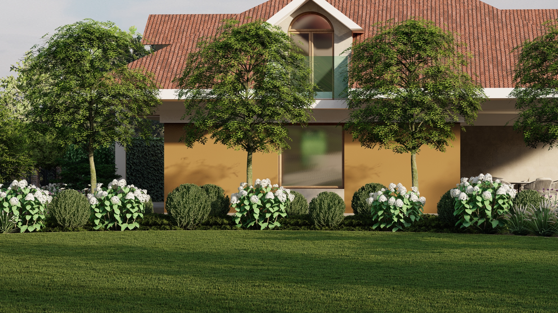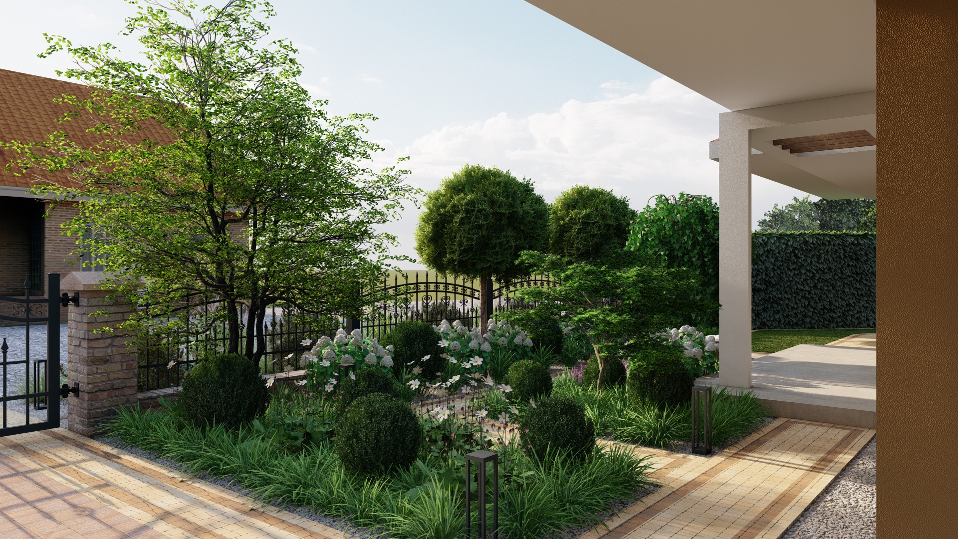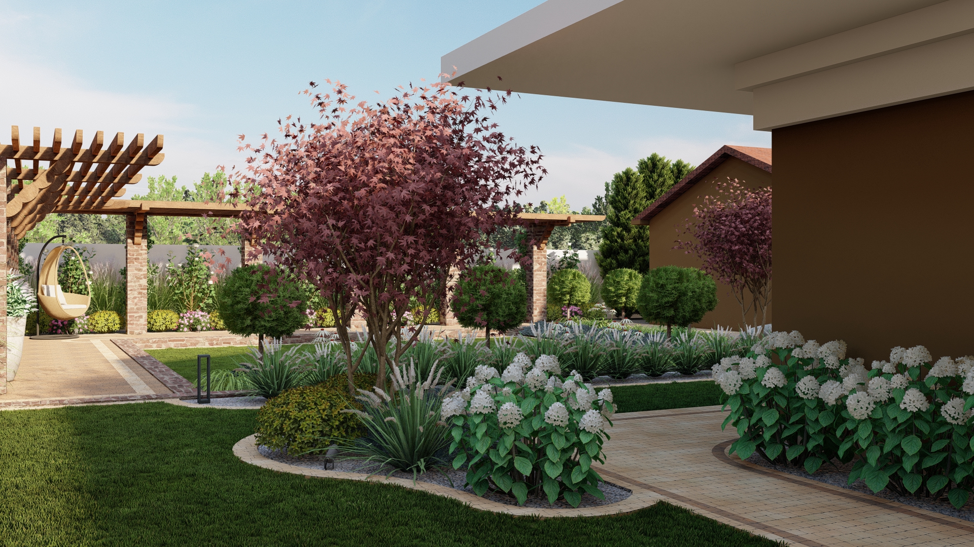 Ogród został otoczony nasadzeniami zapewniającymi prywatność oraz wartość dekoracyjną, a modernizacja komunikacji i oświetlenia pozwoliła na stworzenie funkcjonalnej, spójnej i przyjaznej użytkownikom przestrzeni.