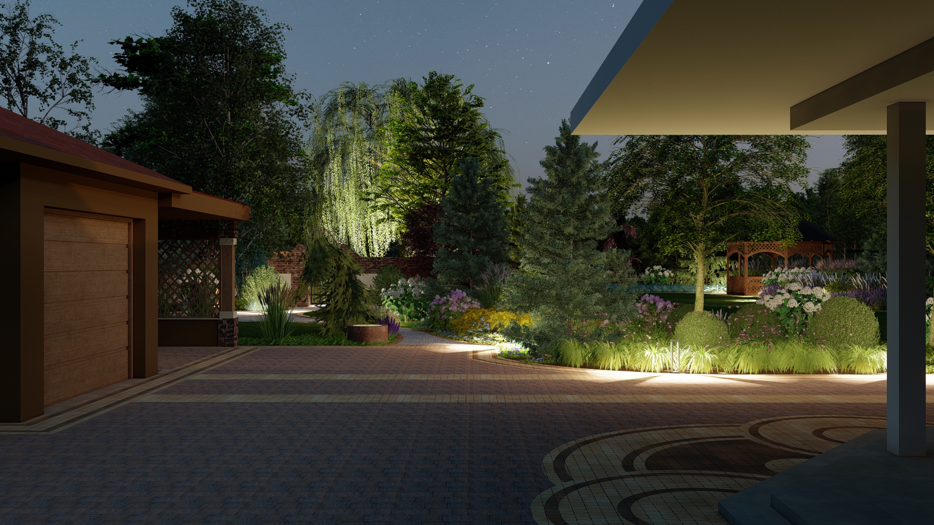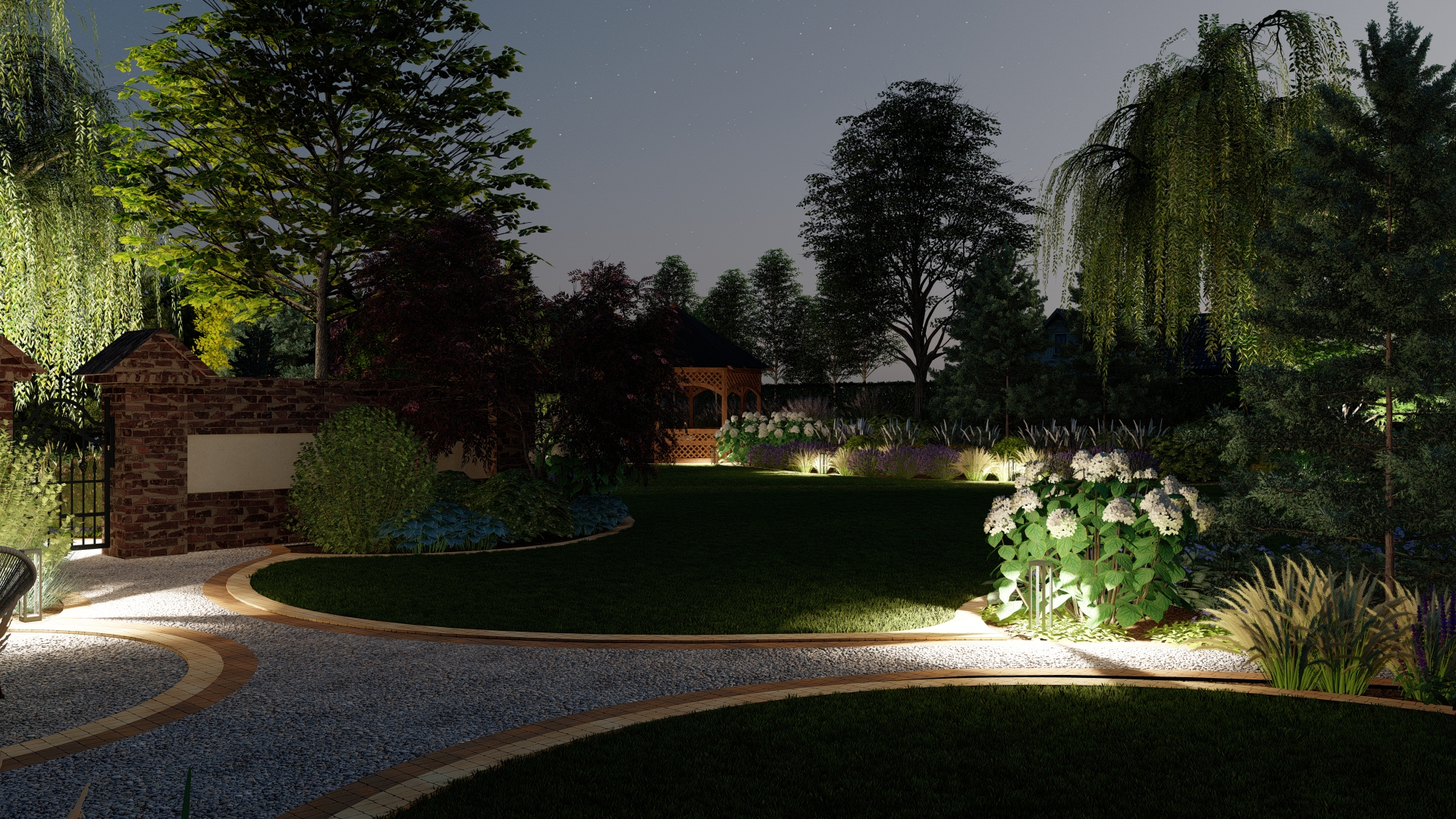 Zaplanowanie oświetlenia ogrodowego – podkreślenie struktury roślin, architektury i tafli wody.